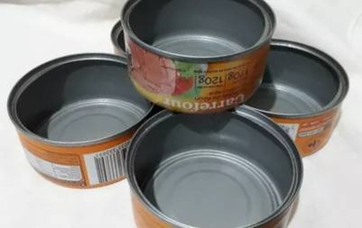 Comienza quitándole la tapa a cada lata de picadillo, en caso de que la siga teniendo, y límpialas bien. Luego con el acrílico del color que más te guste píntalas hasta que queden bien cubiertas por dentro y por fuera.