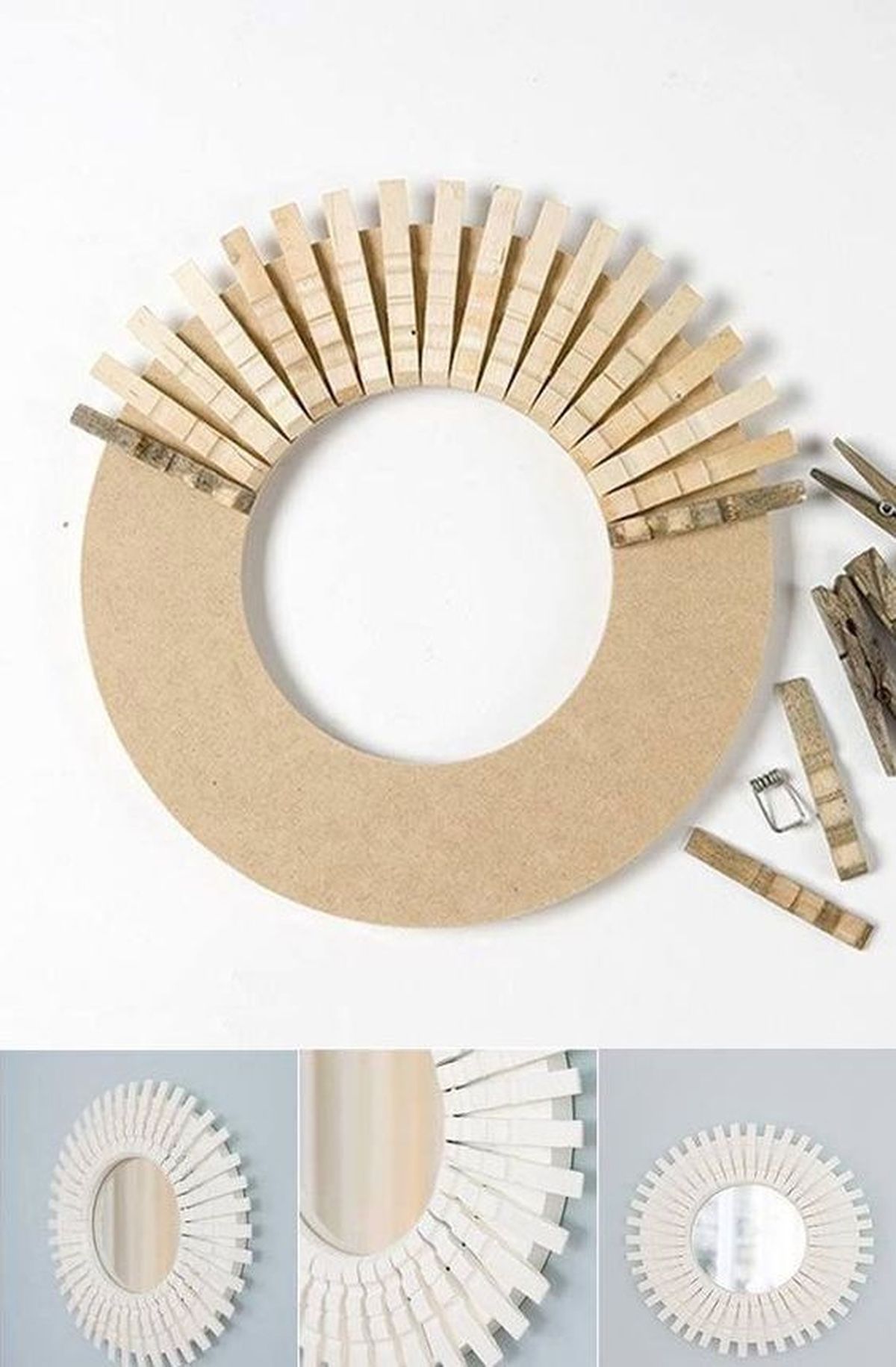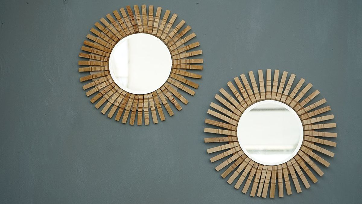 Para realizar un bonito espejo de pared y aprende las claves para decorar con espejos tu dormitorio o recibidor. El diseño en forma de sol se consigue con los broches de la ropa, que tendrás que desarmar para aprovechar sólo las piezas de madera.