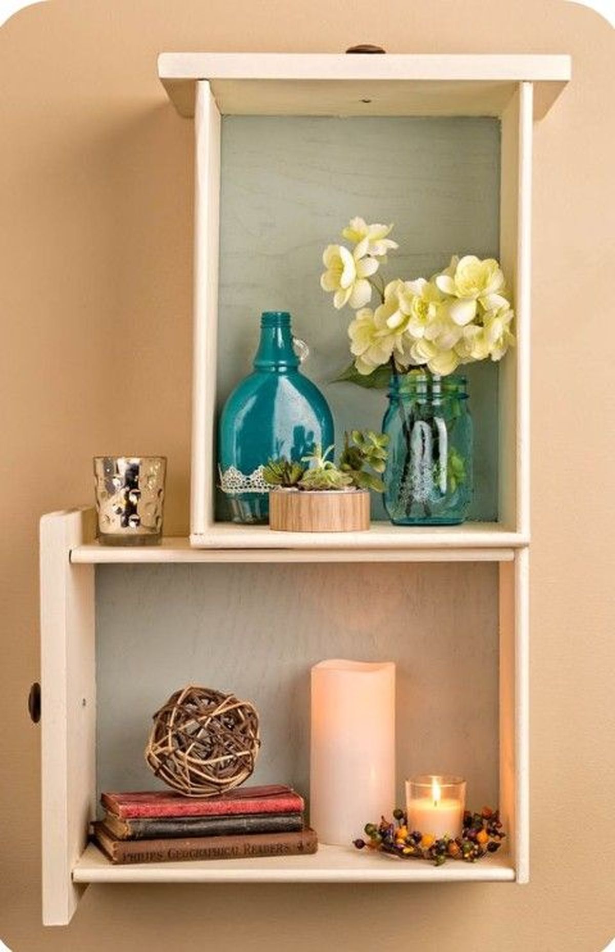 Si tienes cajones viejos y en desuso recíclalos con esta fabulosa idea DIY que sugiere transformarlos en lindos y funcionales estantes decorativos para el hogar.