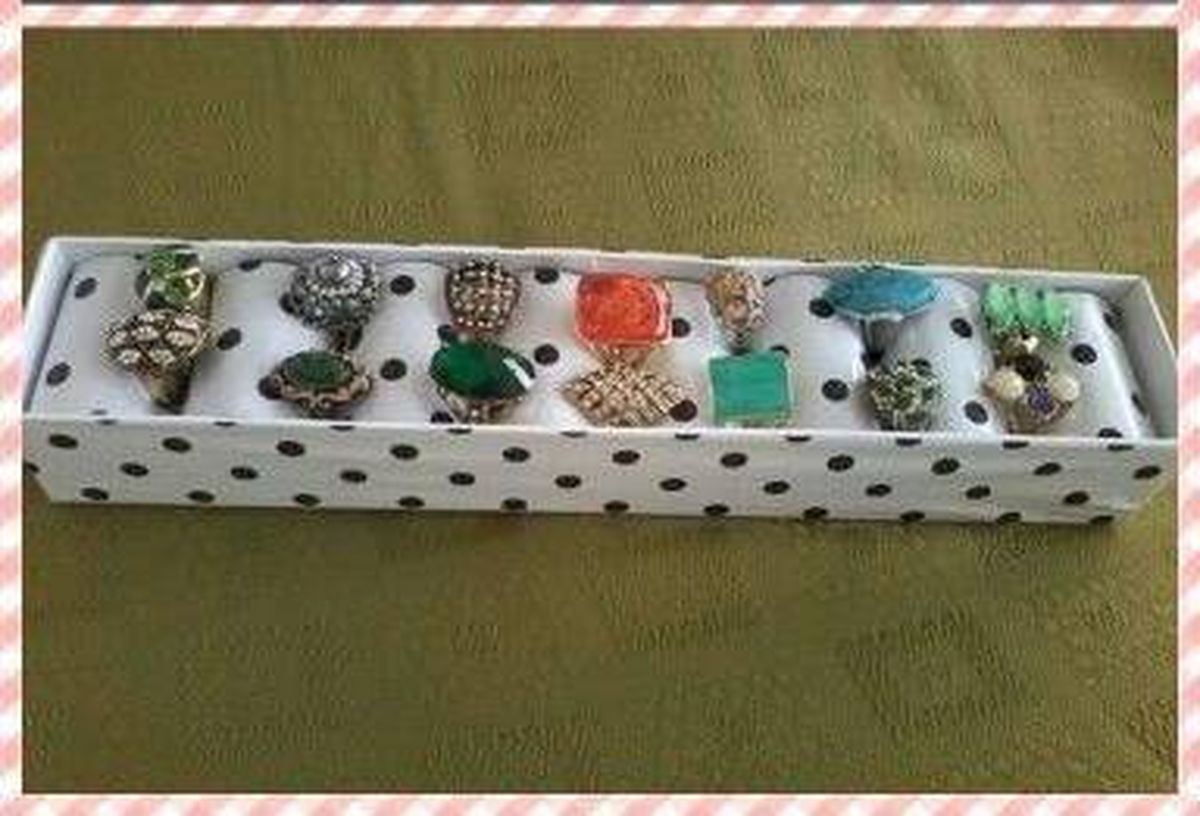 Luego toma la caja de cartón que en caso de ser posible deberá tener el mismo ancho de los ruleros para que encajen bien y fórrala también con la misma tela para que quede todo parejo. Después coloca cada uno de los ruleros dentro de la caja y listo. Tendrás un hermoso alhajero hecho por tus propias manos.