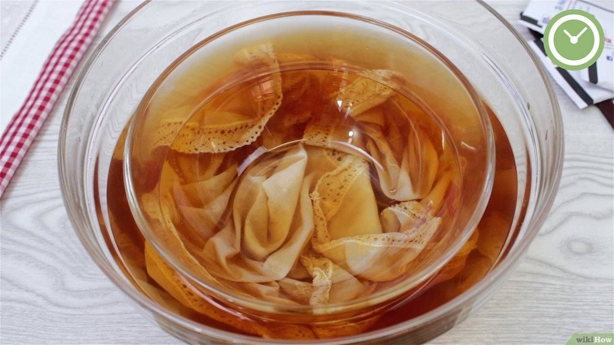 Junta todos los saquitos de té, como mínimo se recomienda usar cinto, seis o más según el tamaño de lo que se vaya a teñir y sumérgelos en un fuentón con agua hirviendo. De esa manera, comenzará a despedir su color y cuando el agua esté completamente teñida, saca los saquitos e introduce la prenda previamente humedecida. Déjala que repose por una hora o hasta que veas que la tela llegó a teñirse con el color deseado.