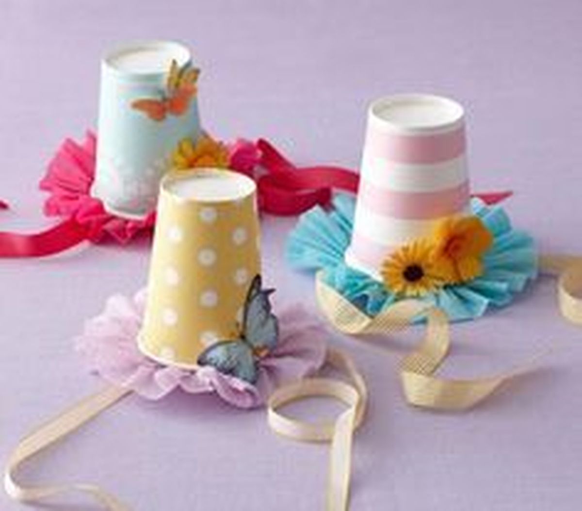 Toma cada uno de los vasos descartables y asegúrate que estén bien limpios. Luego recorta pedazos de tul y comienza a pegarlo al rededor de la boca del vaso para darle forma de sombrero. Después pégale las figuras que desees y decora cada bonete como más te guste.