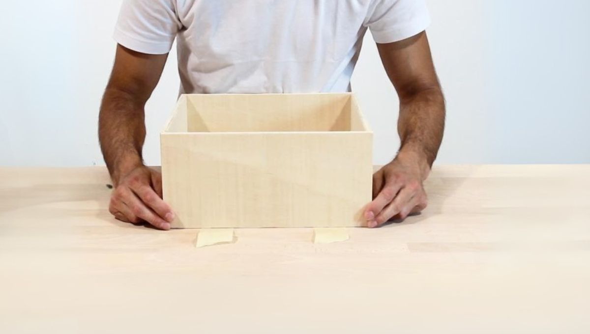 Une los laterales a la base utilizando adhesivo de montaje. Fija con cinta de carrocero para mantener las piezas en su lugar hasta que el pegamento seque por completo.