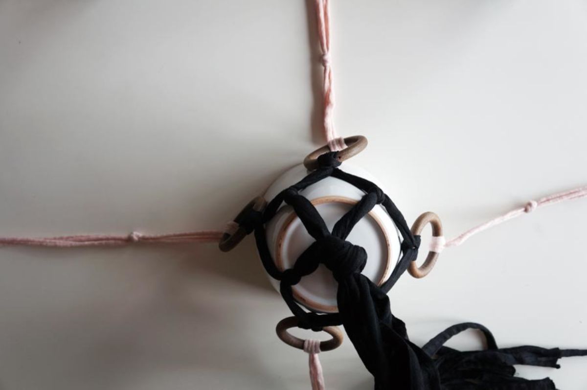 - Anuda las tiras negras entre sí, formando una red. Realiza tres nudos uniformes y ajusta la altura según prefieras.