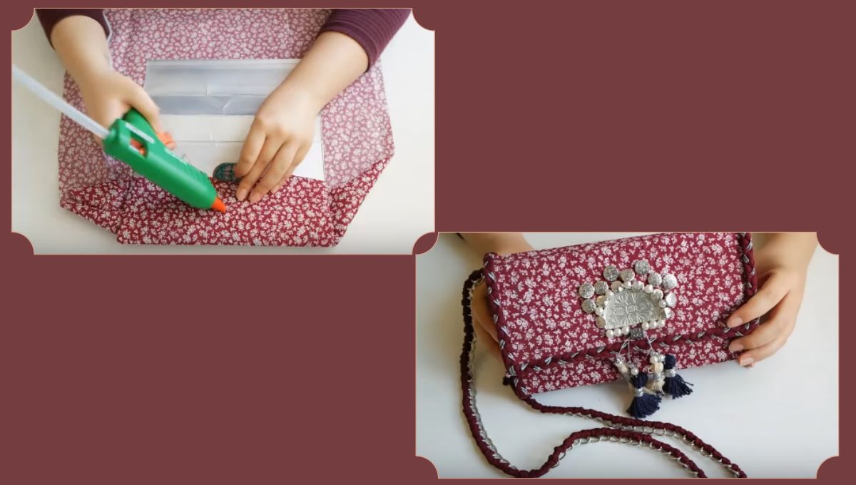 - Estructura del bolso: Forra los laterales del tetrabrik con trozos de cartón cubiertos de tela y pégalos al cuerpo principal con silicona. Luego, añade un trozo de fieltro negro en el interior para reforzar la estructura y darle un acabado más profesional.