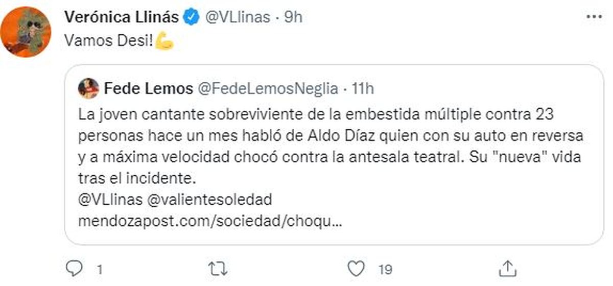 Pasó exactamente un mes y el 10 de agosto en el Hospital Central le dieron al alta para que volviera a su casa a continuar con la recuperación. Fue una muy buena noticia que incluso celebraron Soledad Silveyra y Verónica Llinás, las actrices que actuaron aquella noche de la tragedia en el escenario godoicruceño.