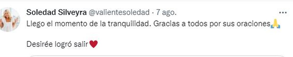 "Del mes que estuve internada nada más estuve despierta siete días. Solo tengo palabras de agradecimientos para los enfermeros, los médicos y las médicas, kinesiólogos, todos. Estuvieron conmigo todo el tiempo".