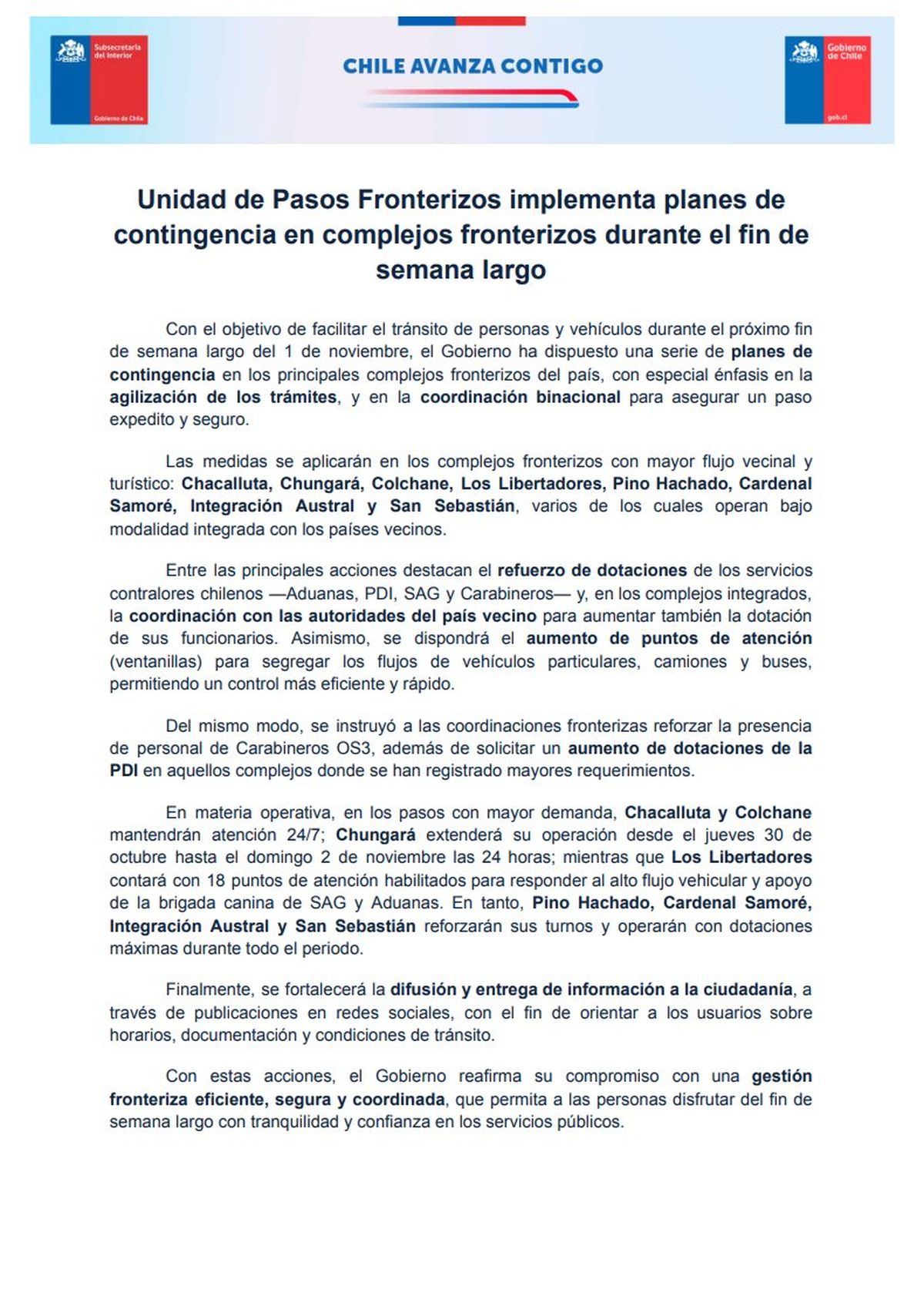 El comunicado chileno señala que se ha instruido “a las coordinaciones fronterizas reforzar la presencia de personal, además de solicitar un aumento de dotaciones en aquellos complejos donde se han registrado mayores requerimientos”.