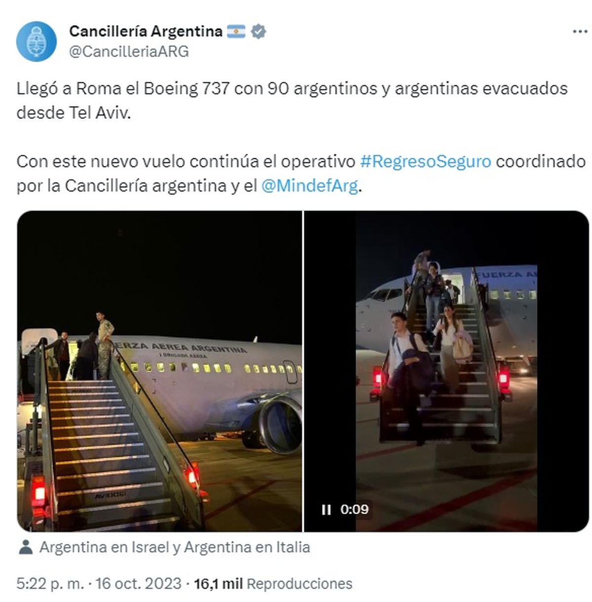 En su cuenta de la red social X, el Ministerio de Relaciones Exteriores informó que "llegó a Roma el Boeing 737 con 90 argentinos y argentinas evacuados desde Tel Aviv".