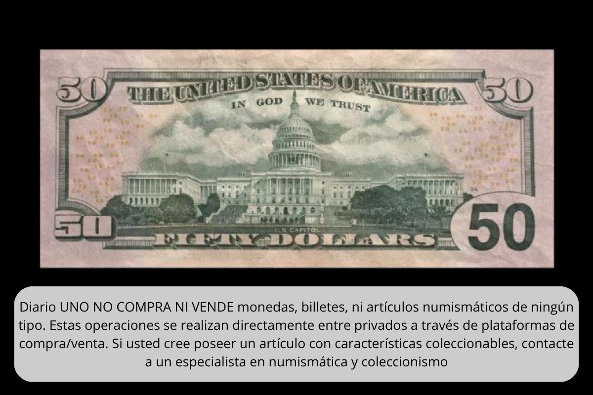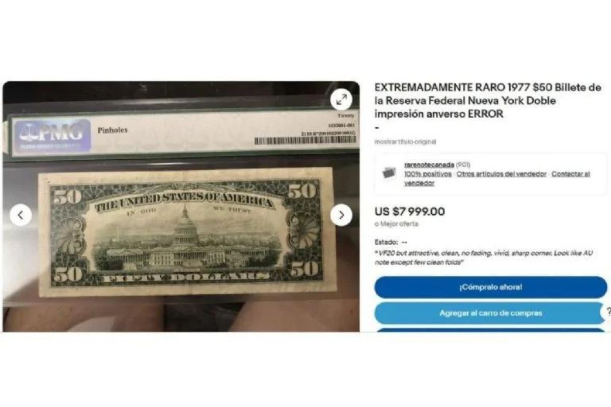 El siguiente billete de 50 dólares fue publicado en la plataforma online de compraventa reconocido, por un valor de 8 mil dólares. De acuerdo con la descripción del ejemplar de 50 dólares, se trata de una pieza con un error de impresión doble en el reverso del billete. Al tratarse de un detalle minúsculo, varios coleccionistas de monedas y billetes se mostraron interesados por el producto.