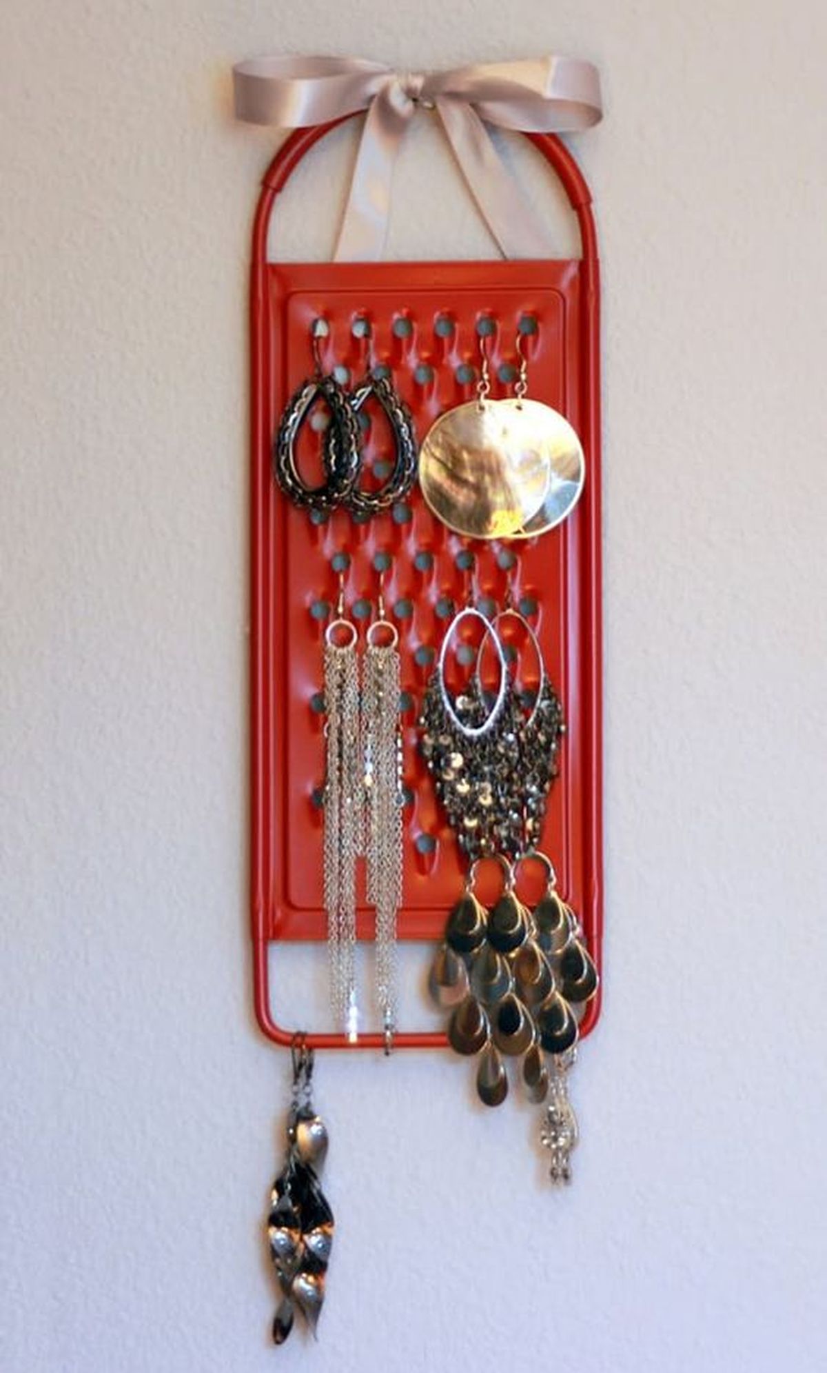 En caso de que tengas un rallador viejo y sin usar en la cocina, reutilízalo con esta idea DIY que te propone convertirlo en un lindo y original alhajero para colgar tus collares, pulseras y aritos.