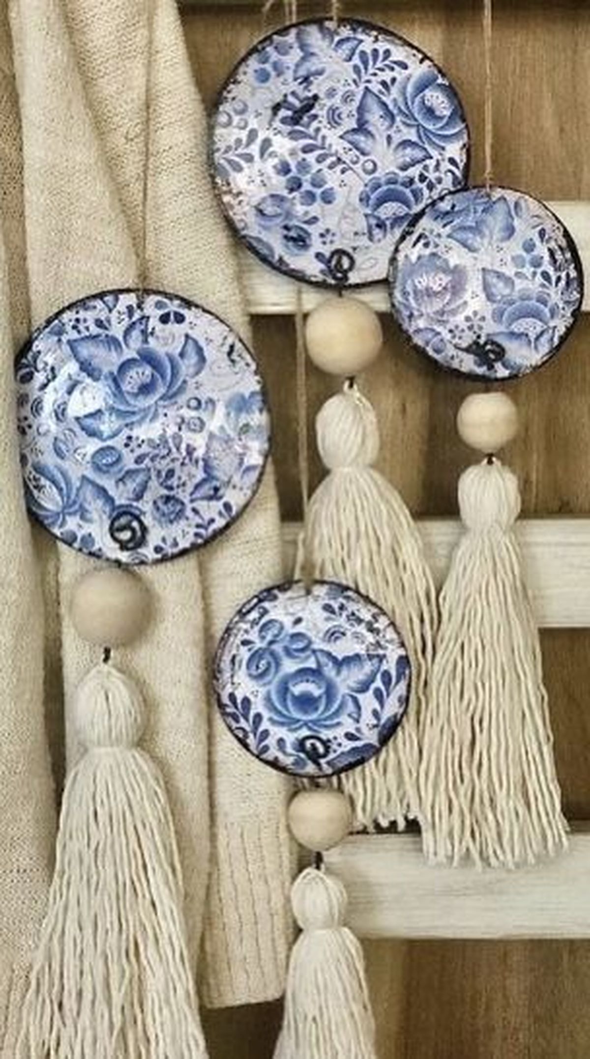 Después coloca la bolita de madera, realiza de vuelta otro nudo y para terminar agrega una borla hecha previamente con hilo de algodón grueso o lana de color natural. Y listo, te quedarán hermosos colgantes para decorar los espacios.