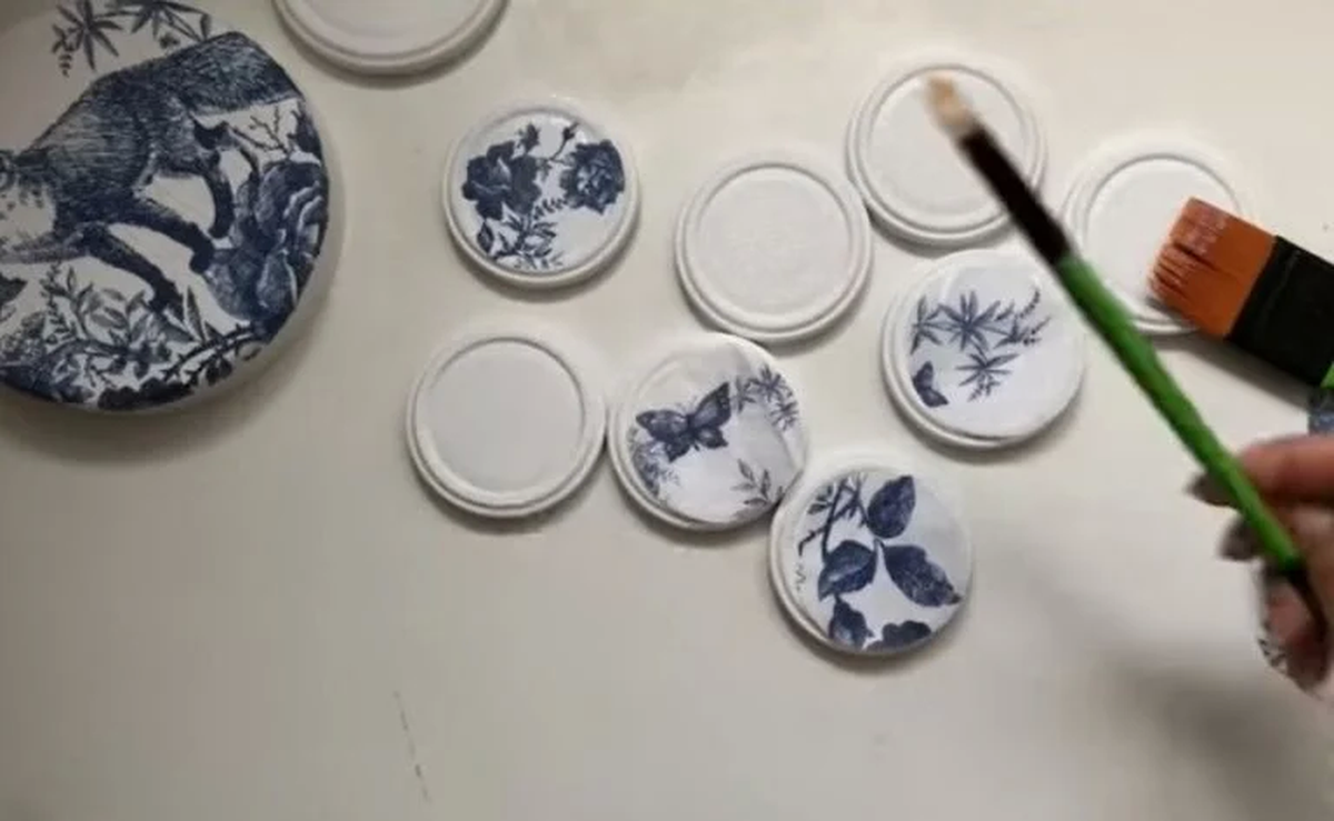Toma todas las tapas de frasco y límpialas bien. Luego, dependiendo de color que sean, dales una mano con pintura blanca hasta que queden bien cubiertas y deja secar. Después toma la servilleta de papel con diseño, separa las capas de la misma dejándote sola la que tiene el dibujo y comienza a realizar la técnica del decoupage con cuidado en 8 tapas.