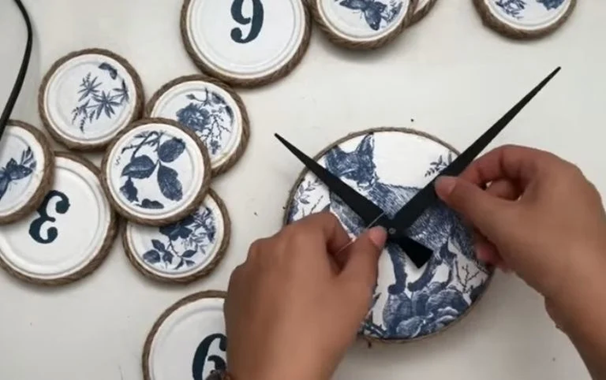 Por otra parte, toma cuatro tapas y a cada una píntale con negro los números 12, 3, 6 y 9 para que sean la guía del reloj. Después agarra una tapa más grande que la usarás para el centro y también aplica la técnica con la servilleta, deja secar bien y luego con un taladro u otra herramienta, realízale en el medio un agujero para pasar las agujas del reloj.