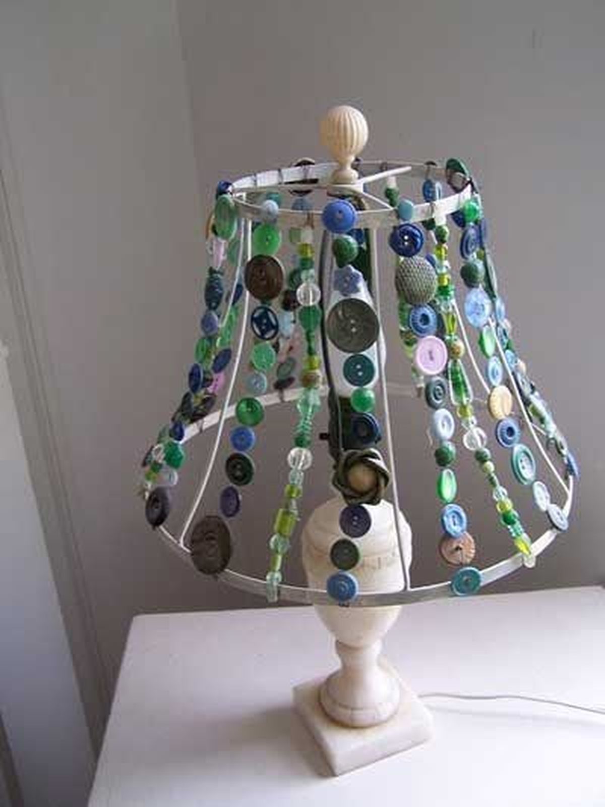 Para empezar toma la estructura de la lámpara que vayas a utilizar y fíjate cuántas líneas con botones le agregarás. Luego corta las tiras de tanza o alambre fino para manualidades y comienza a atarlos separadamente en la base de la estructura. Si usas el alambre ayúdate con una pinza para engancharlo y darle varias vueltas.