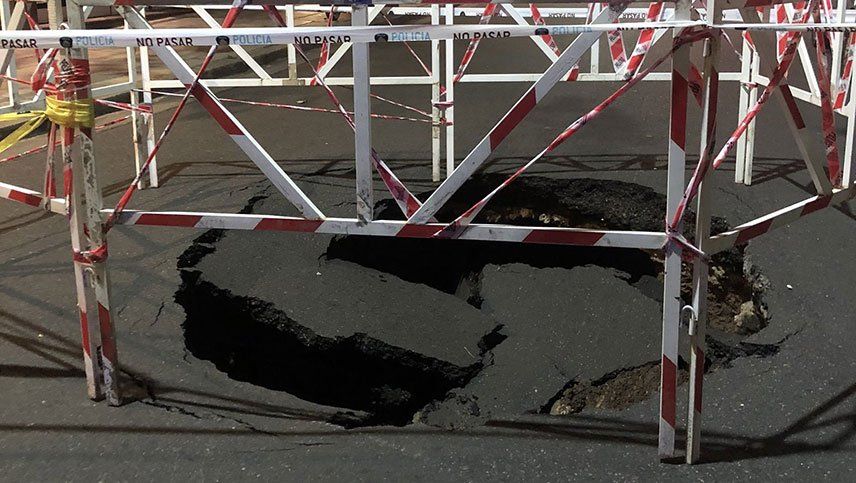 Los vecinos informaron que el pavimento "comenzó a hundirse anoche" por lo que colocaron una maceta para evitar que los vehículos pasen por ahí hasta que personal de la Ciudad "puso un corralito".