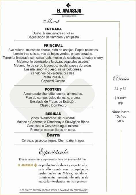 El Amasijo: (Ugarte 802, La Puntilla) Cena show 24 y 31 de diciembre. Entrada, principal y postre. Incluye bebidas y barra. $3.600 por persona.