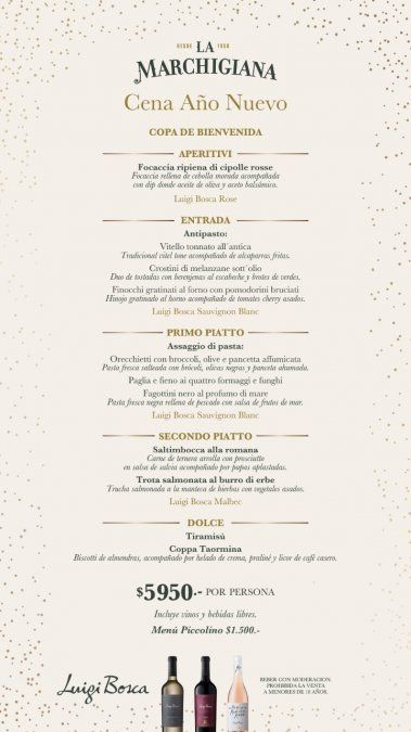 La Marchigiana: (Patricias Mendocinas 1550 de Ciudad) Copa de bienvenida y menú de cinco pasos. Incluye vinos y bebidas libres. Solo el 31 de diciembre. $5.950.