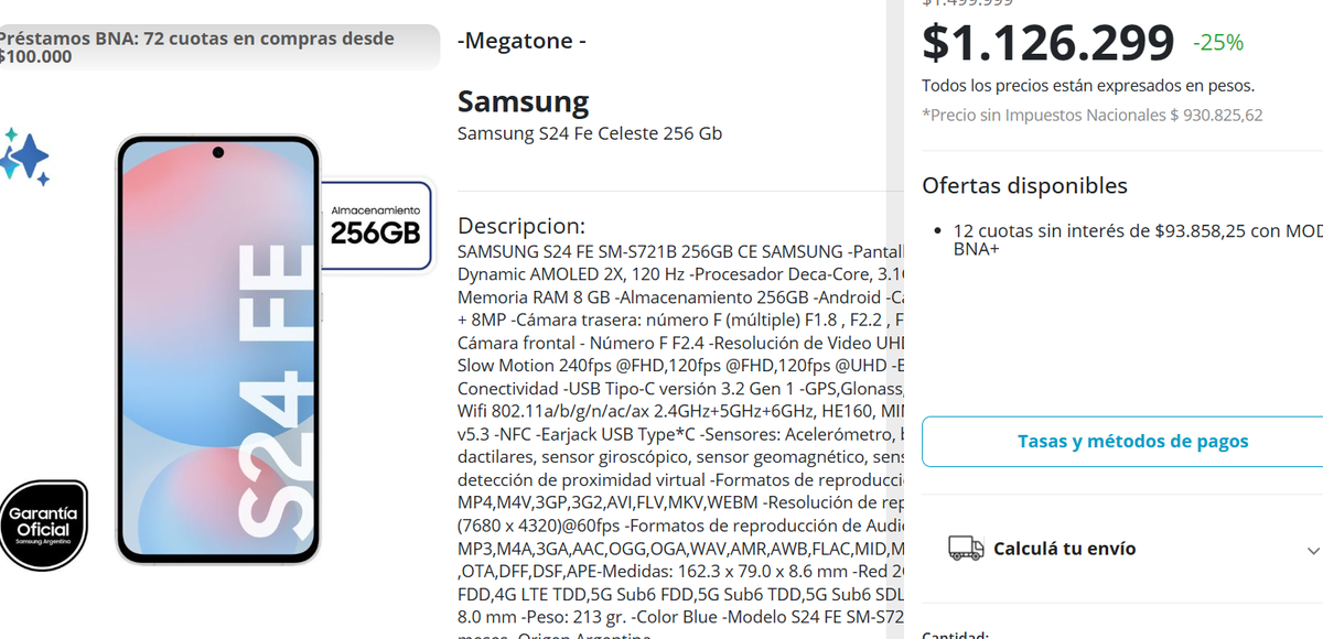 Pero este descuento no es el único beneficio que se tiene a la hora de comprar el Samsung S24. Además de la quita del 25% del precio, con Modo también se lo puede adquirir con 12 cuotas sin interés, quedando cada una de ellas en $93.858,25.