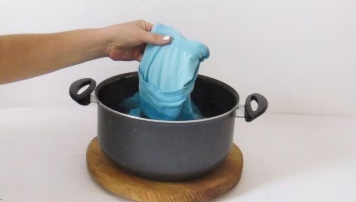 Dejar la prenda dentro de la olla con agua hasta que se enfríe o durante unos 10 minutos. Luego quitar la prenda y escurrirla.