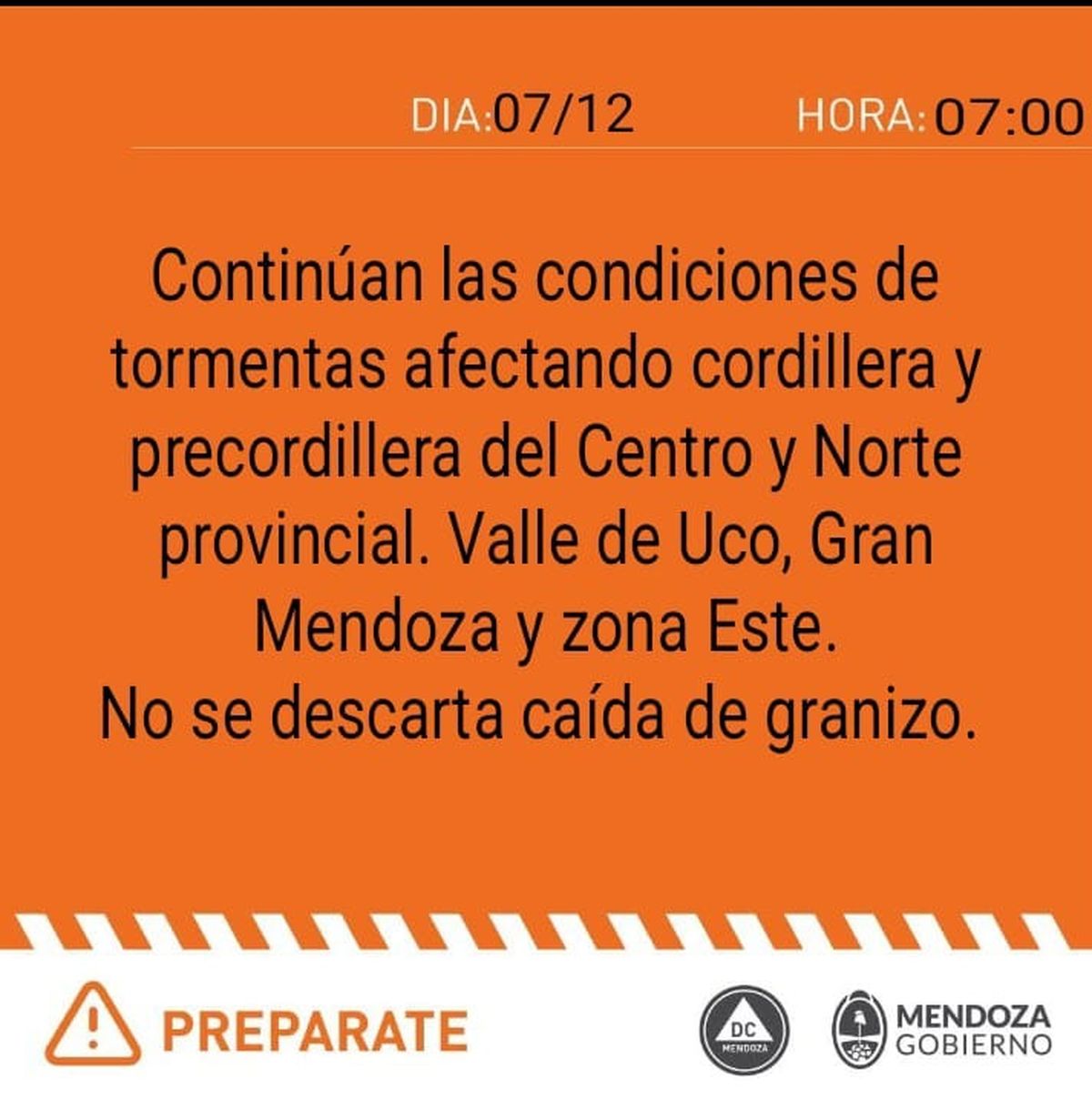 El alerta naranja rige para la cordillera y precordillera del Centro y Norte, Valle de Uco, Gran Mendoza y zona Este. No se descarta la caída de granizo.