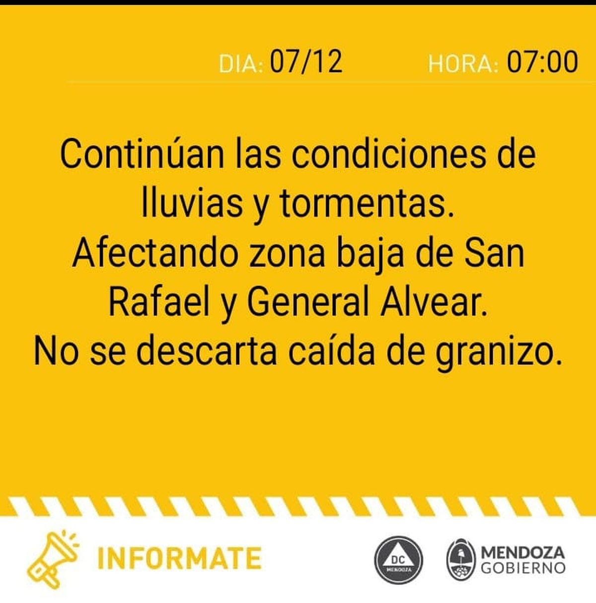 Las precipitaciones que se vienen registrando desde la madrugada se extenderán en el Valle de Uco y parte Sur del Gran Mendoza hasta alrededor de las 20 de este domingo 7 de diciembre. Aunque, en estas zonas, no se observan desarrollos importantes de tormentas con granizo.