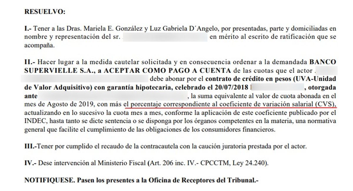 En 23 de mayo, A.F.V. consiguió que la jueza Cecilia Landaburu ordenara recalcular su deuda con el Banco Supervielle en CVS desde el año 2019: