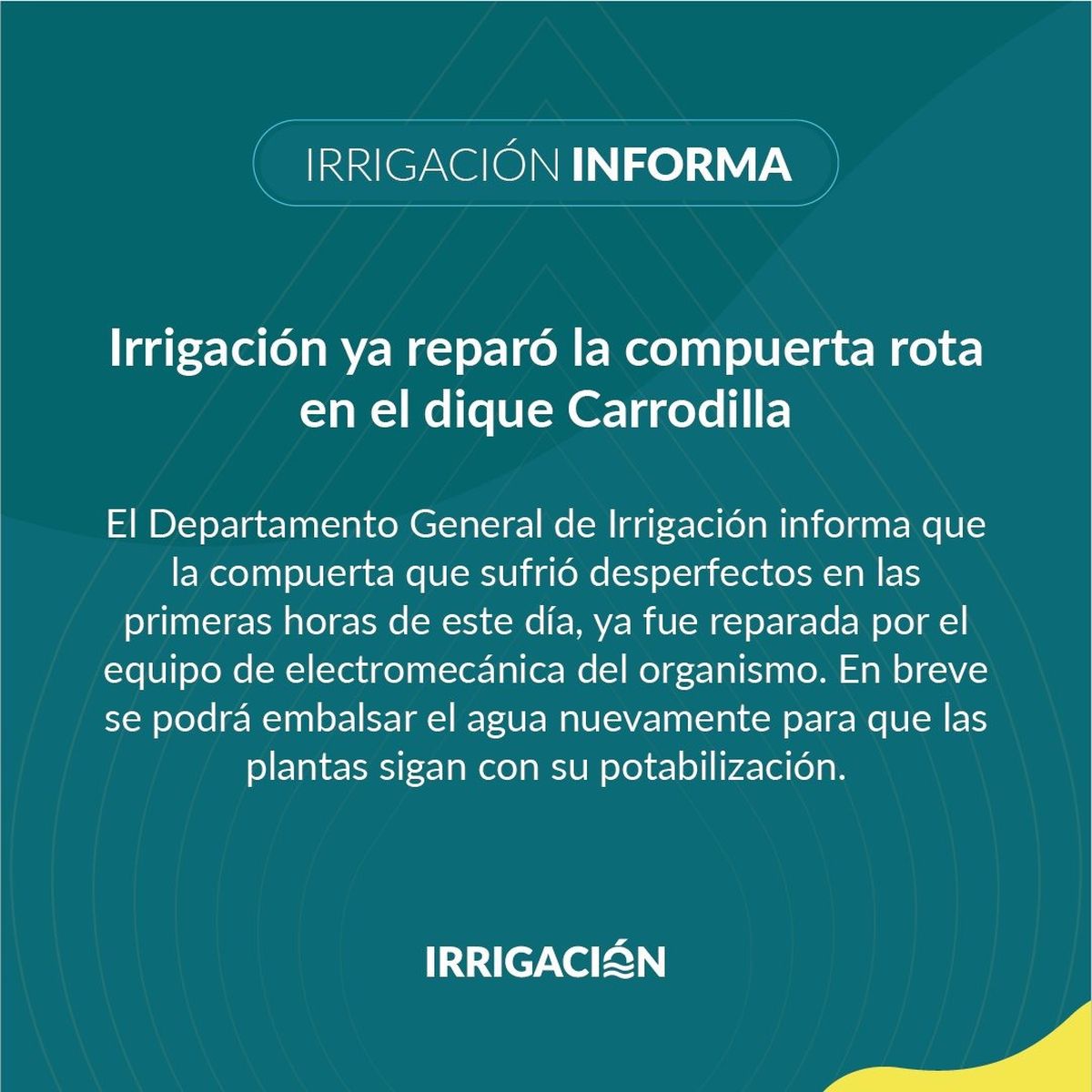 A la 1.25 de este martes, el Departamento General de Irrigación emitió un comunicado en el que informó que ya estaba reparada la compuerta rota que causó los inconvenientes.