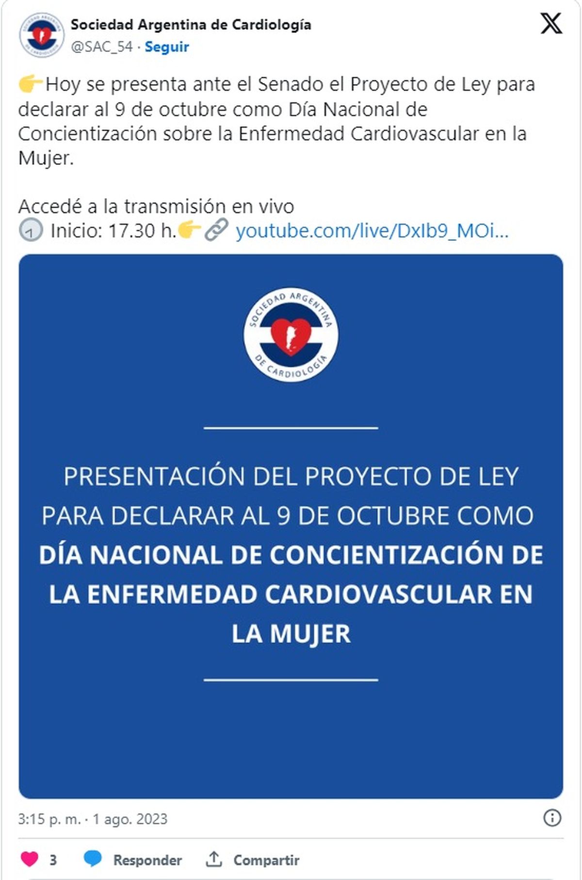 Si bien la presentación oficial del proyecto de ley para declarar al 9 de octubre como el Día Nacional de Concientización de la Enfermedad Cardiovascular en la Mujer se realizó 4 de mayo, la propuesta de la normativa volvió a presentarse en las últimas horas en el Senado para informar los detalles de la normativa.