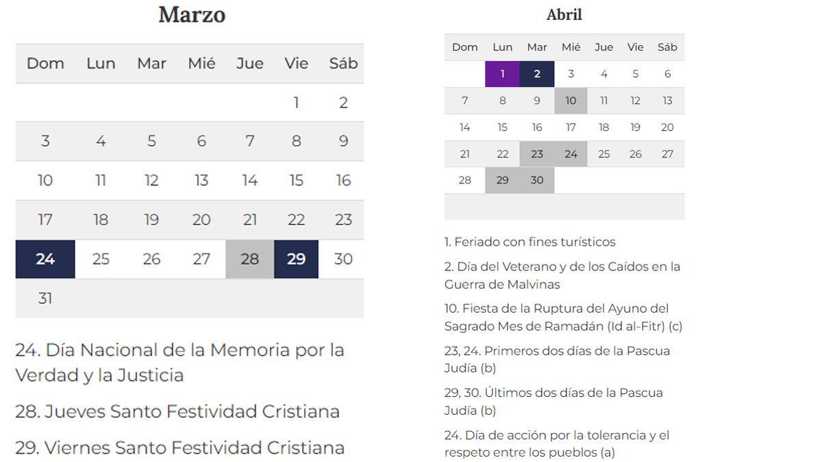 - Lunes 1 de abril: Feriado puente con fines turísticos.