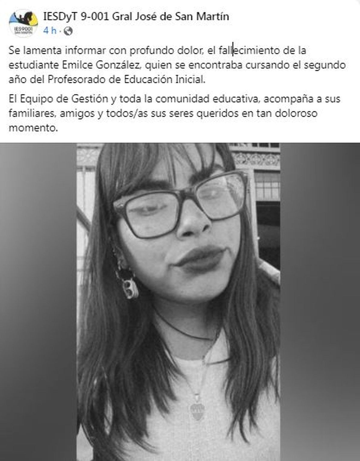 Desde su perfil de Facebook, la entidad educativa la despidió con un sentido mensaje: "El Equipo de gestión y toda la comunidad educativa, acompaña a sus familiares, amigos y todos/as sus seres queridos en tan doloroso momento".