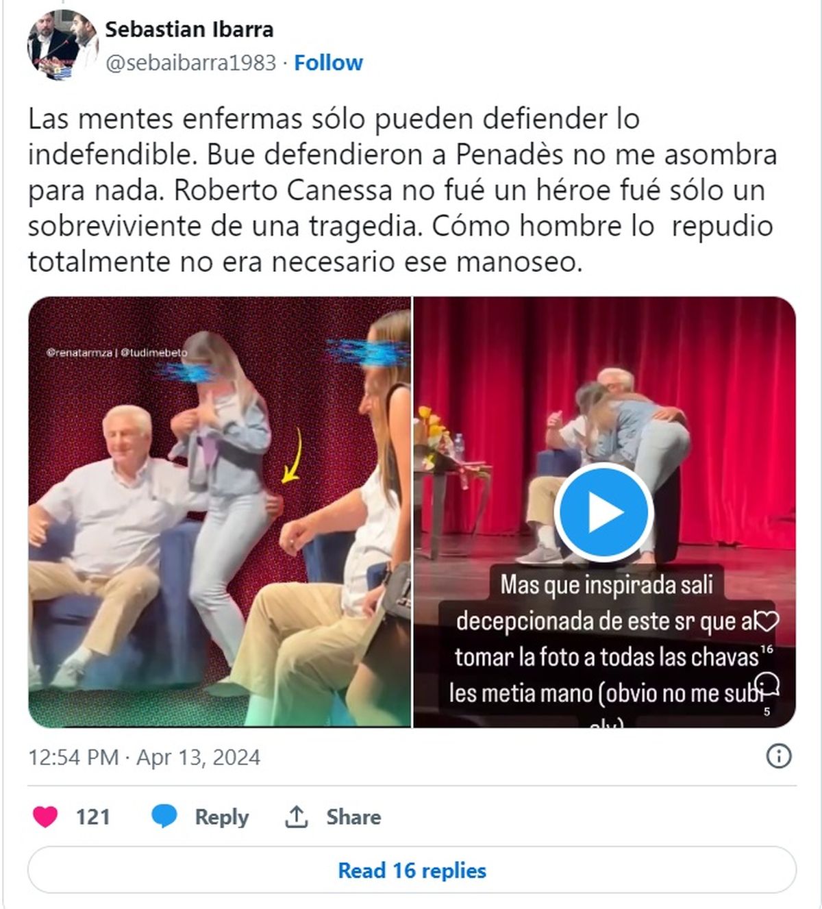 Las imágenes muestran al uruguayo de 71 años sentado en un sillón azul sobre un escenario mientras abraza a una joven a la altura de la cola para sacarse una foto. “Realmente admiraba mucho a Roberto Canessa hasta esto, terrible experiencia a la hora de la foto”, denunció en un mensaje en su cuenta de X la usuaria @renatarmza.