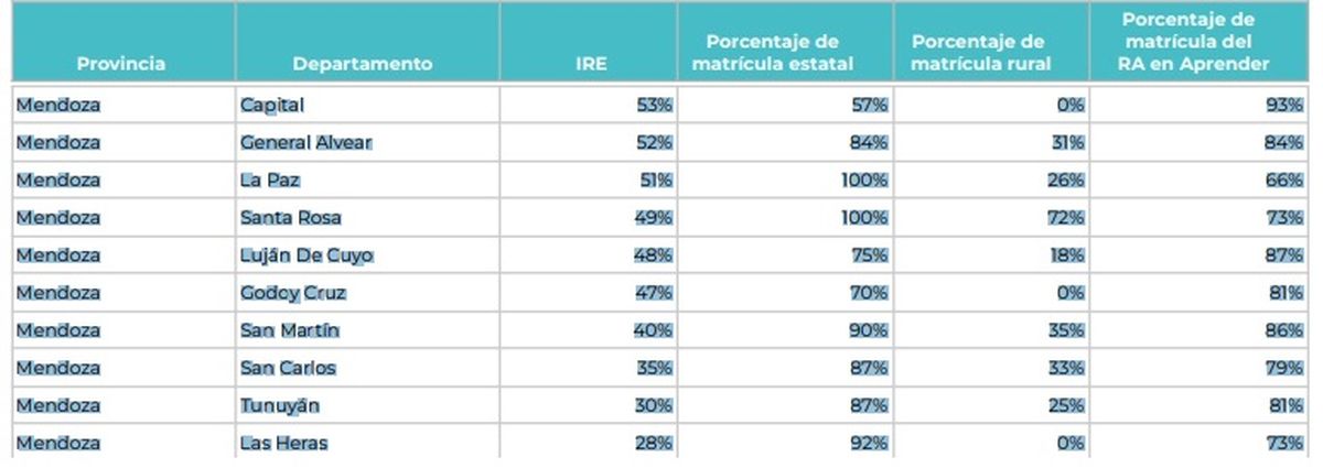 En Mendoza, los departamentos estudiados que mostraron un IRE más bajo fueron Las Heras y Tunuyán; mientras que el más alto se encontró en la Capital, donde a su vez se encuentra la mayor cantidad de porcentaje de chicos que asisten a colegios privados.