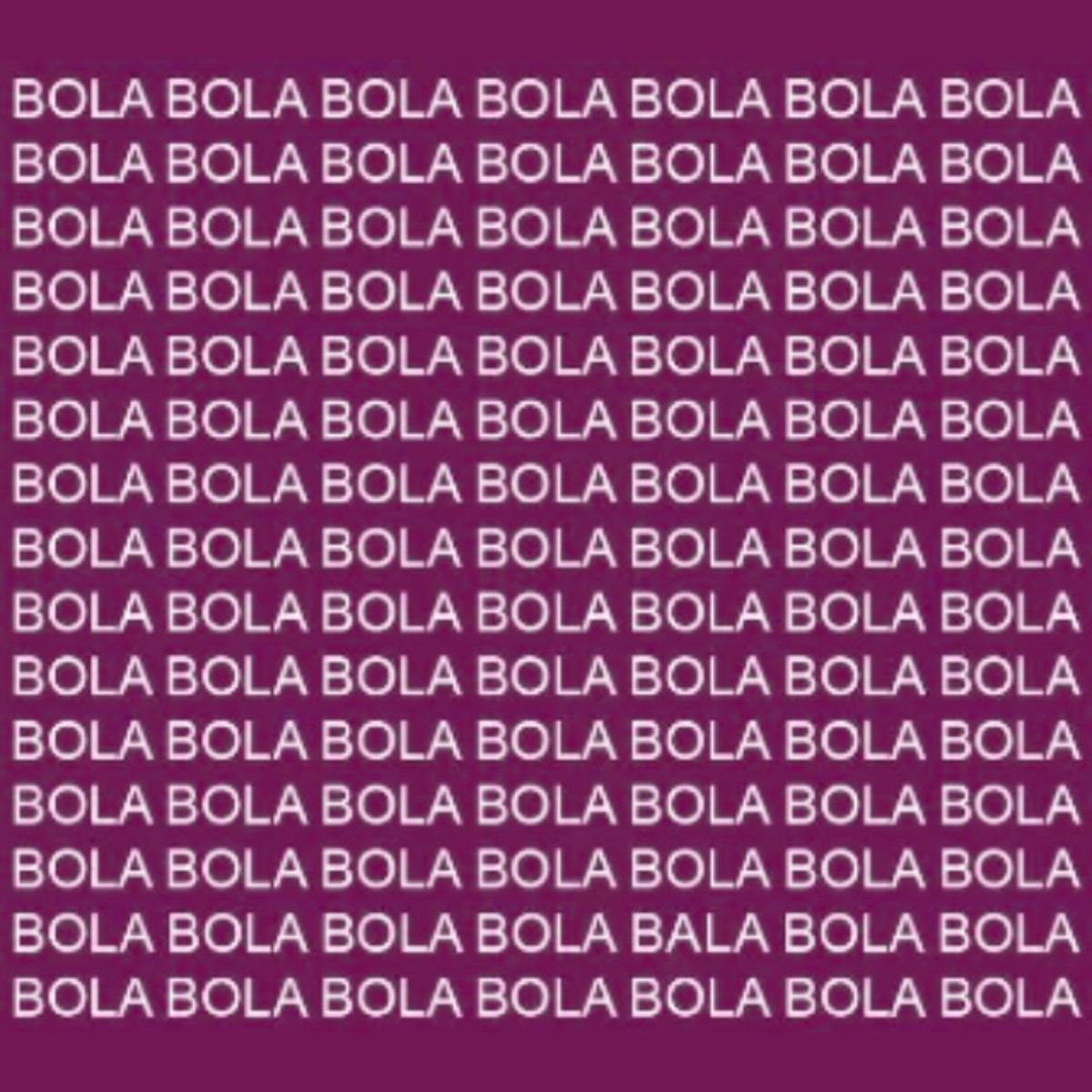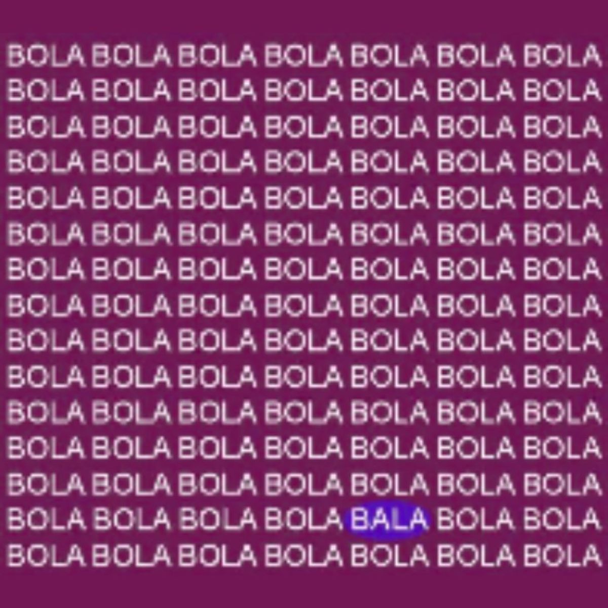 Para ayudarte a comprender mejor el acertijo visual te pondremos en contexto: lo que deberás hacer es observar una imagen y en ella encontrarás repetida muchas veces una palabra particularmente elegida para distraerte por su similitud con nuestra palabra objetivo en este desafío visual, en este caso la palabra BOLA. No obstante una de ellas es una palabra en particular, diferente a la palabra BOLA y esta es la que deberás encontrar.