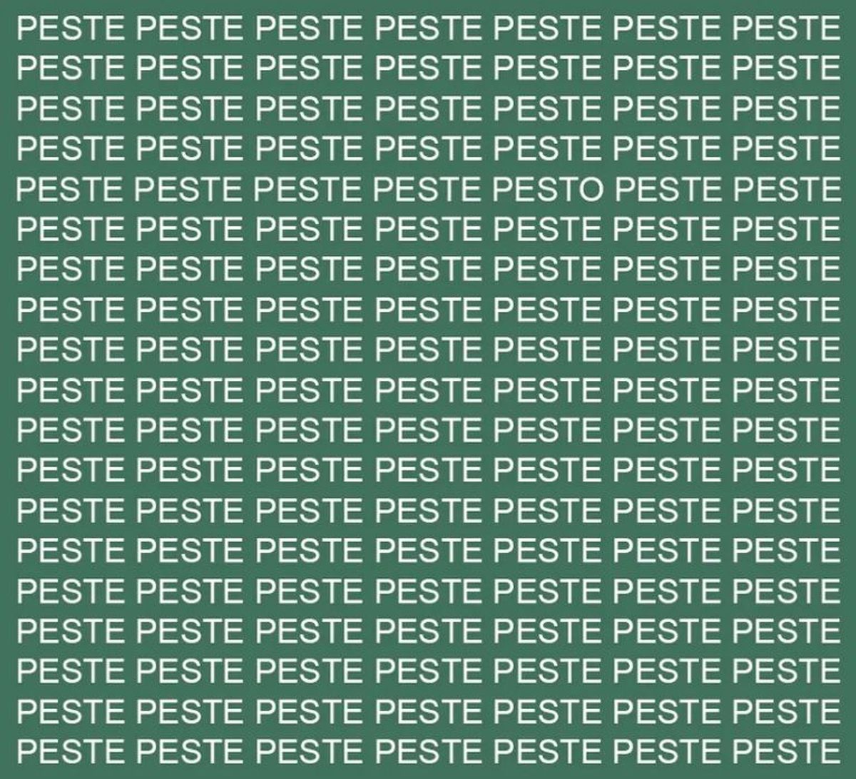 ¿Lograste encontrar la palabra del desafío visual en menos de 7 segundos? En caso de que ello hallas conseguido: ¡Felicidades! No obstante, si no hallas la palabra PESTO aquí te dejamos la solución a este acertijo visual: se encuentra en la quinta columna y quinta fila.