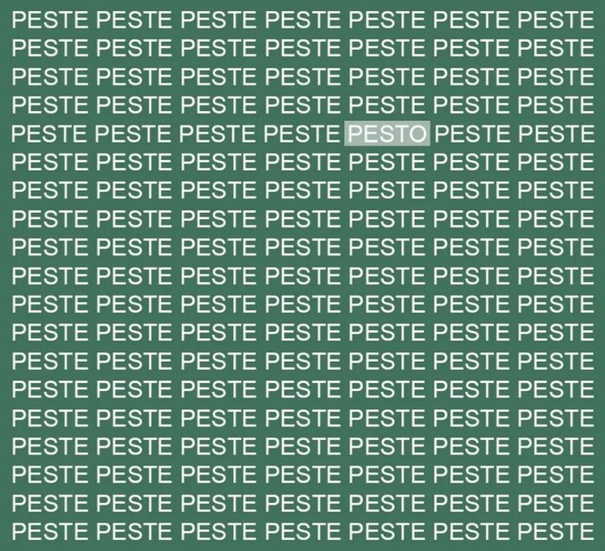 Para ayudarte a comprender mejor el desafío visual te pondremos en contexto: lo que deberás hacer es enfrentarte a una imagen en ella encontrarás muchas letras sueltas aparentemente sin sentido que o que conforman otra palabra, no obstante algunas de ellas conforman una palabra en particular y esta es la que deberás encontrar. La palabra oculta dentro de la imagen del acertijo visual es PESTO.