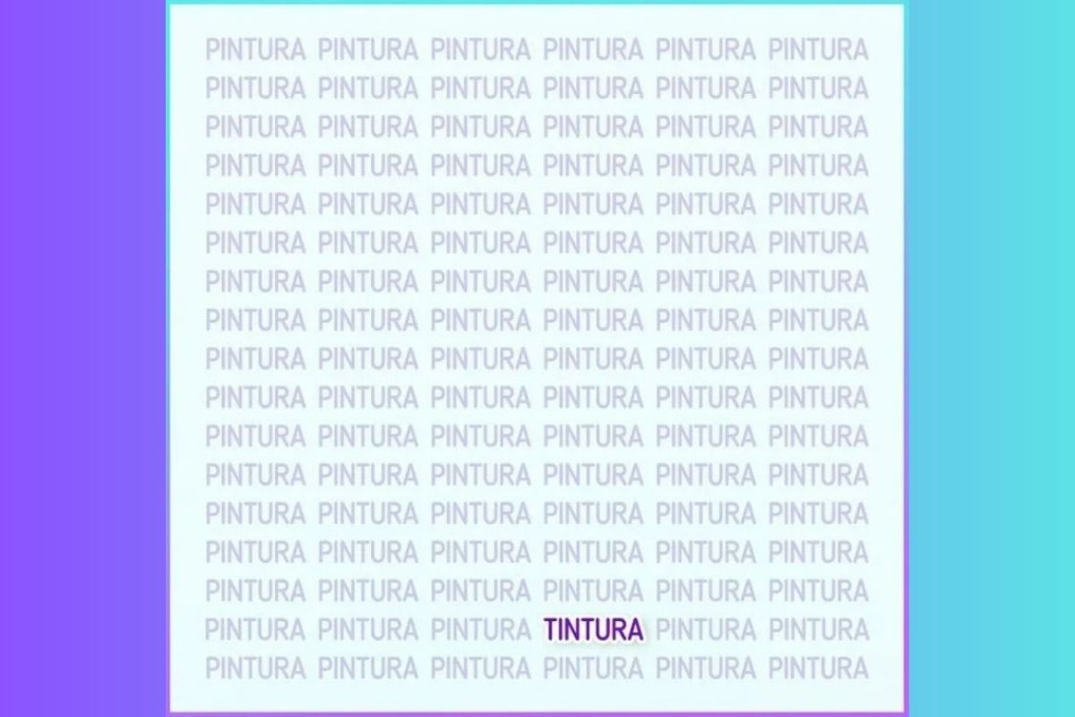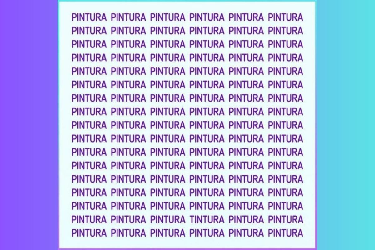 La imagen de este acertijo visual cautiva con su fondo celeste y las letras mayúsculas en un enérgico color morado. Sin embargo, la verdadera complejidad radica en el degradé que se forma en las palabras ubicadas en la mitad inferior de la composición. Allí, entre las 17 filas y 6 columnas que conforman la repetición de la palabra "PINTURA", se esconde un término intruso. Este término alterado por una sola letra es la palabra "TINTURA". Descubrir su presencia es el desafío visual que se nos plantea.