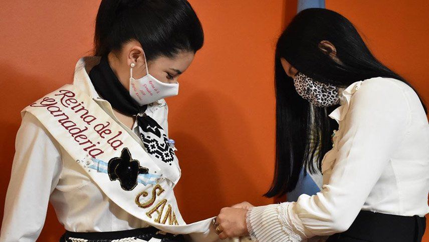 Durante la semana pasada, en el municipio de Santa Rosa, la intendenta Flor Destéfanis coronó a la Reina de la Ganadería departamental. Esta vez no solo la banda indica los dones reales, sino también el tapabocas.