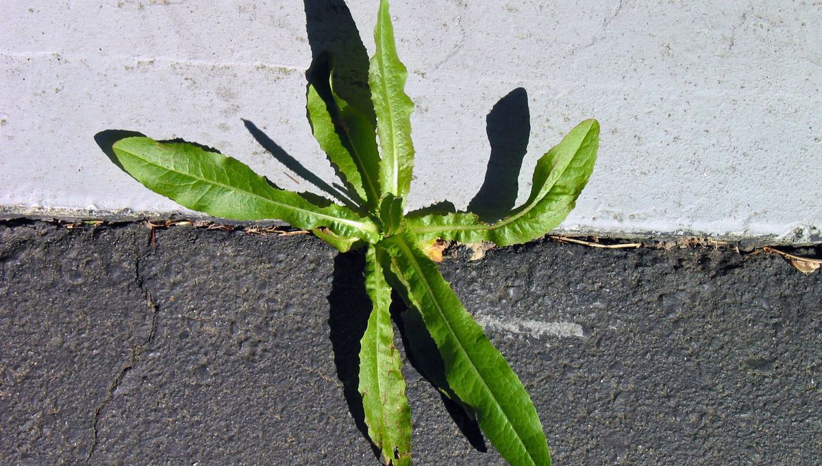 Muchas veces las plantas de hierba mala crecen en la unión de baldosas o cemento. Suelen tener raíces profundas hacia abajo o raíces rastreras horizontales.