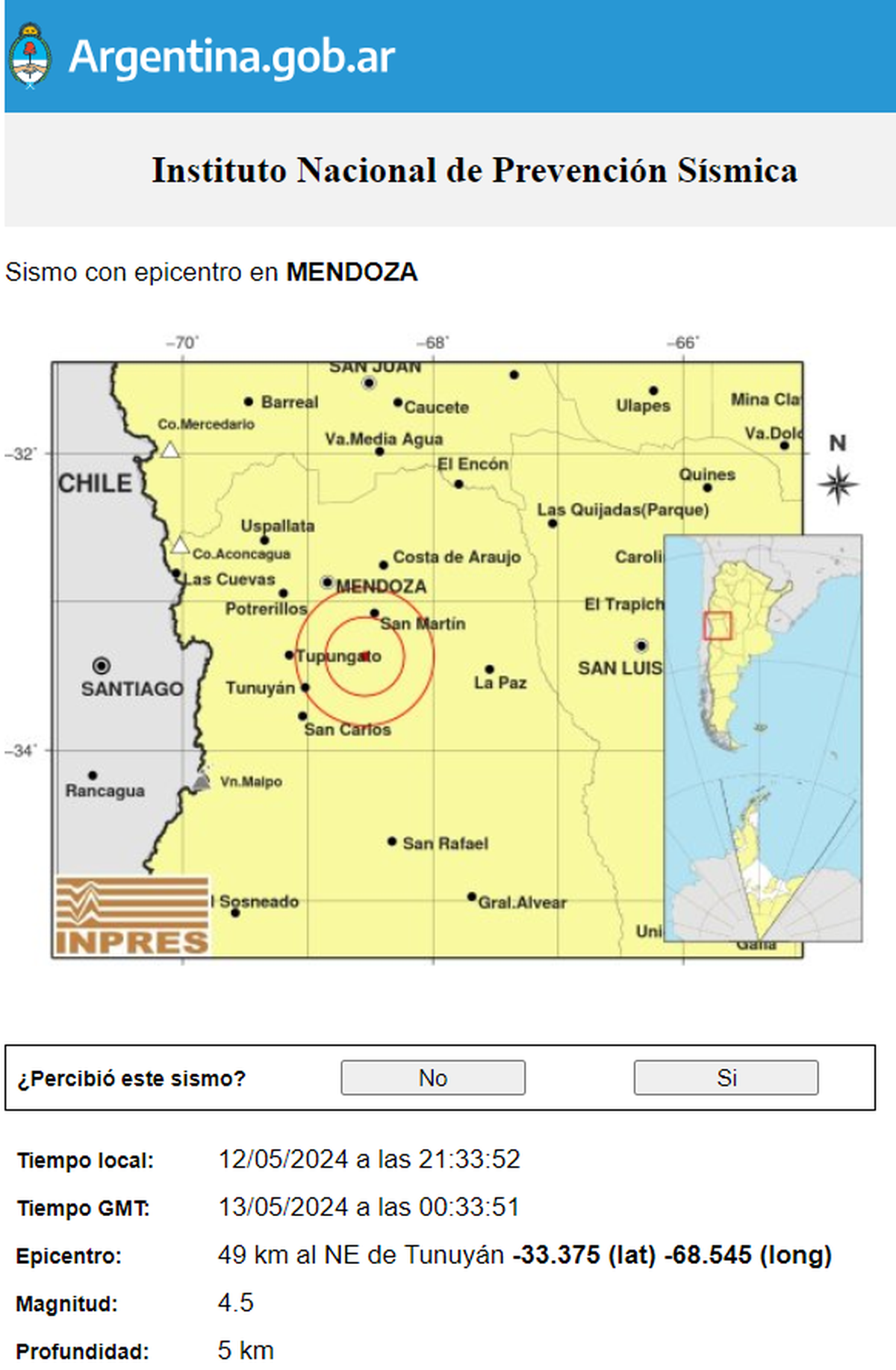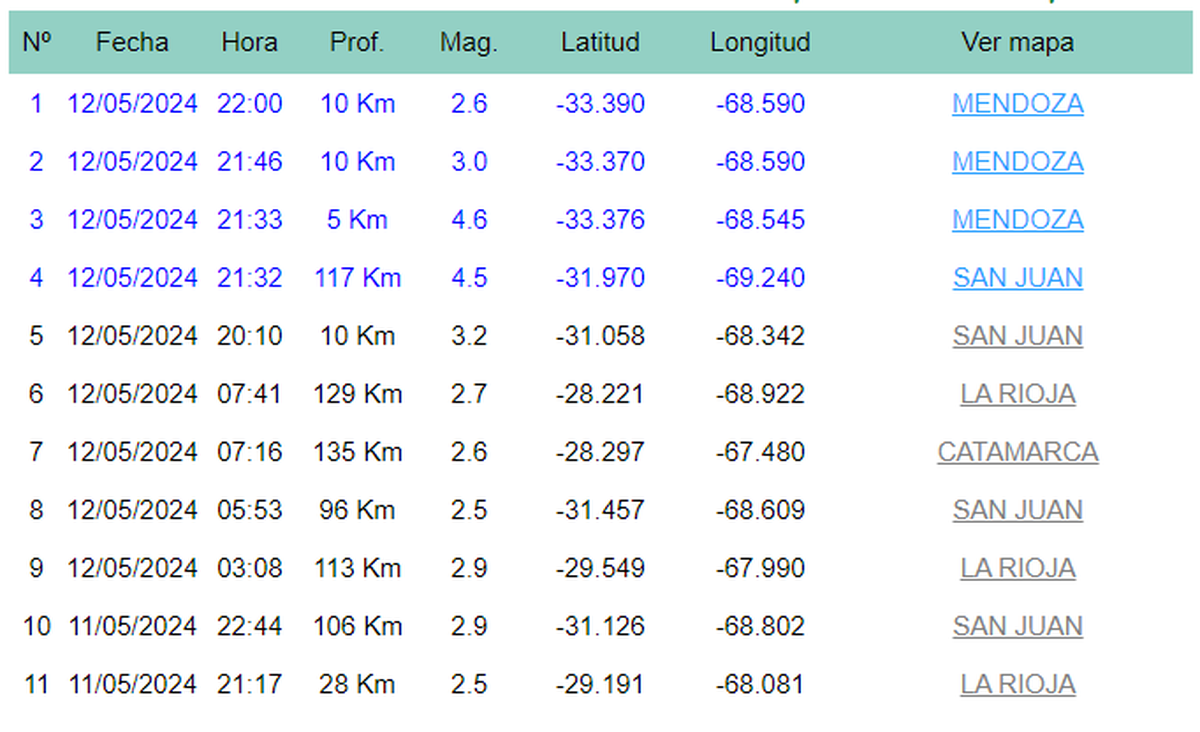 El primer sismo, a las 21.32, fue de 4.5 grados y tuvo una profundidad de 117 kilómetros al norte de Uspallata. Otros sismos fueron entre Tupungato y Rivadavia