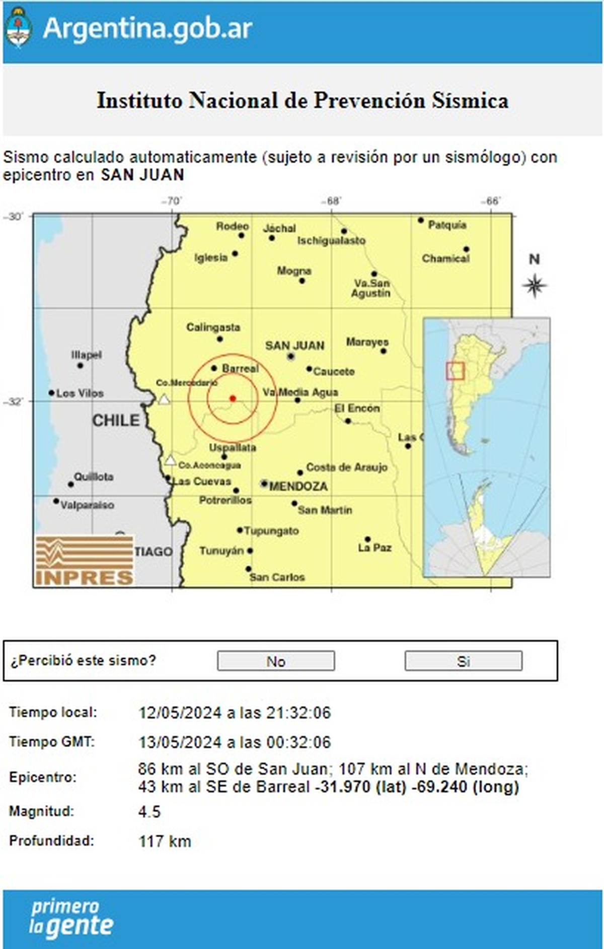 El Instituto Nacional de Prevención Sísmica (INPRES) detalló que el sismo, a las 21.32 de este domingo, fue de 4.5 grados y tuvo una profundidad de 117 kilómetros.