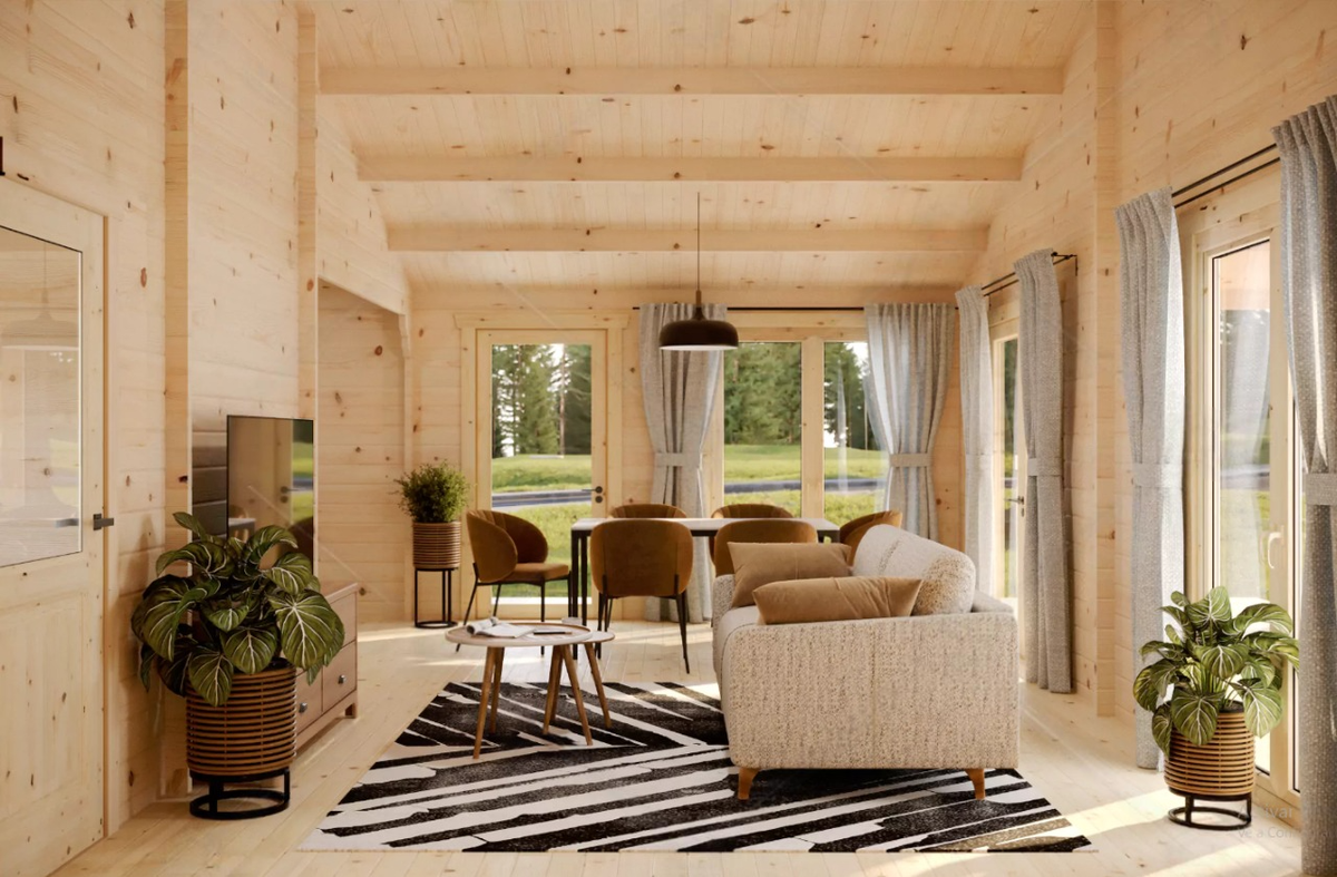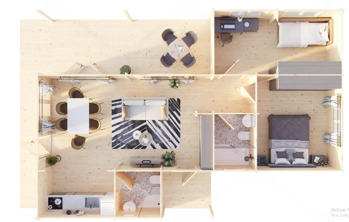 Construida de madera y con un diseño tradicional, esta casa prefabricada es perfecta para alojar a una familia de hasta tres integrantes. Cuenta con ciertas características y espacios que la hacen una vivienda funcional y confortable, como: