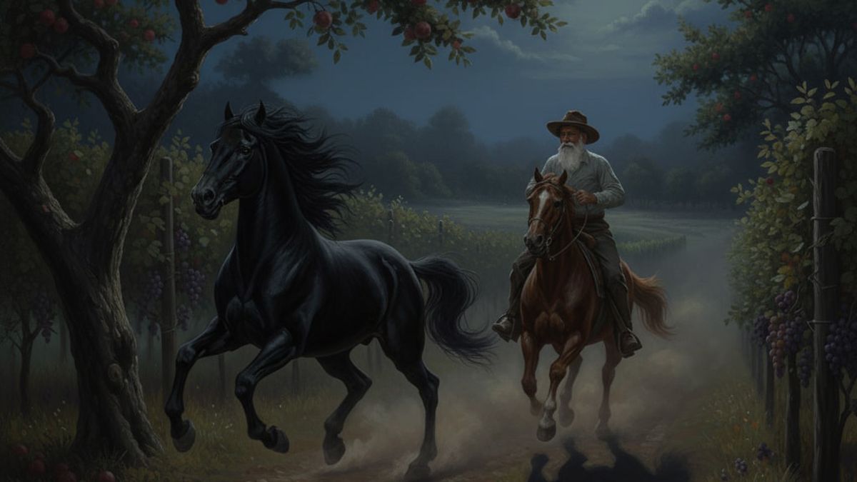 Escucharon el relincho de un caballo y salieron al instante, con el temor de que alguien quisiese robar alguno de los propios. Una bestia negra lastimó la tierra en su huida y no pudieron asegurar de qué criatura se trataba. La oscuridad la ocultó en una maniobra veloz y escalofriante para asegurarse, después de haberse llevado lo suyo, que nunca más la volvieran a ver.
