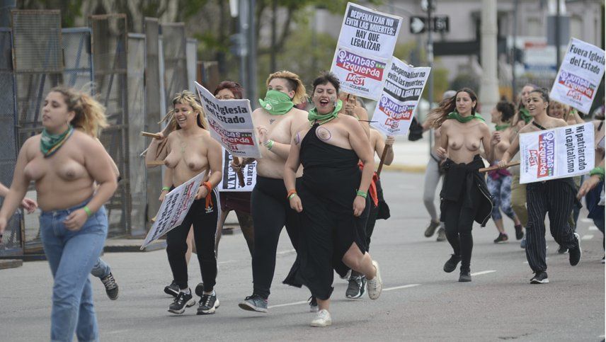 Un centenar de mujeres de partidos de izquierda, bajo la premisa de "aborto legal ya" y en rechazo a la relación del Estado con la Iglesia, se manifestó con sus cuerpos descubiertos y mostrando sus senos en las puertas de la catedral de La Plata.