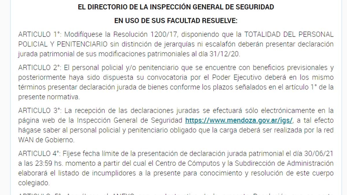 Mediante la resolución 344 publicada este miércoles en el Boletín Oficial, la IGS decidió modificar el reglamento y decidió que "la totalidad de personal policial, sin distinción de jerarquía o escalafón, deberá presenta declaración jurada de bienes".