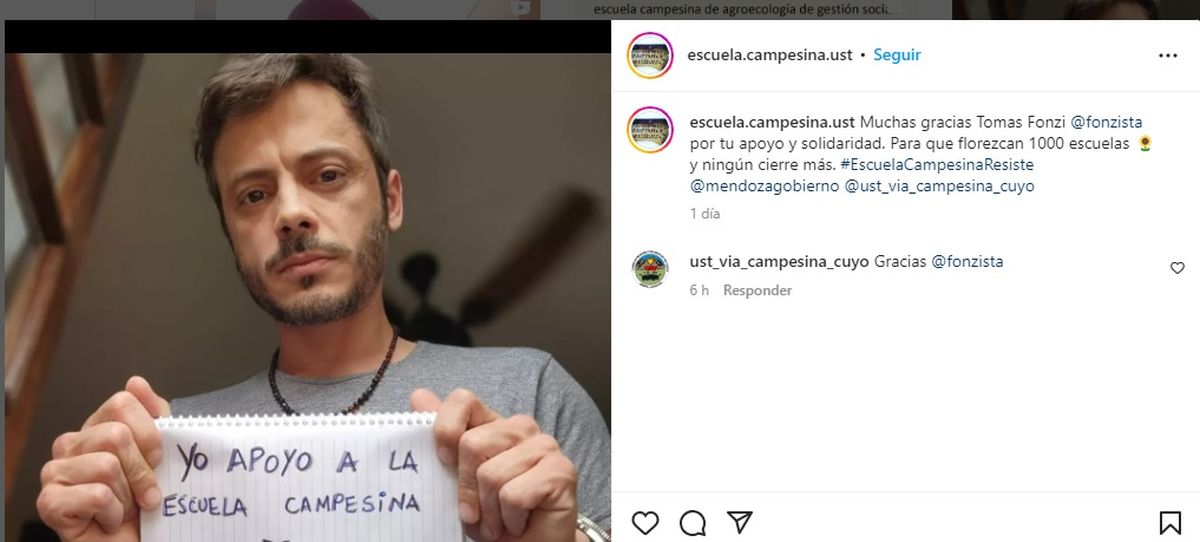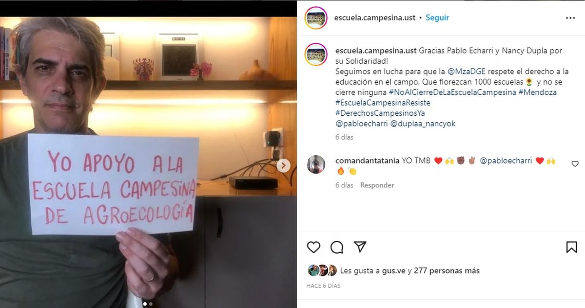 El actor Pablo Echarri también se solidarizó con la Escuela Campesina de Agroecología de Lavalle.