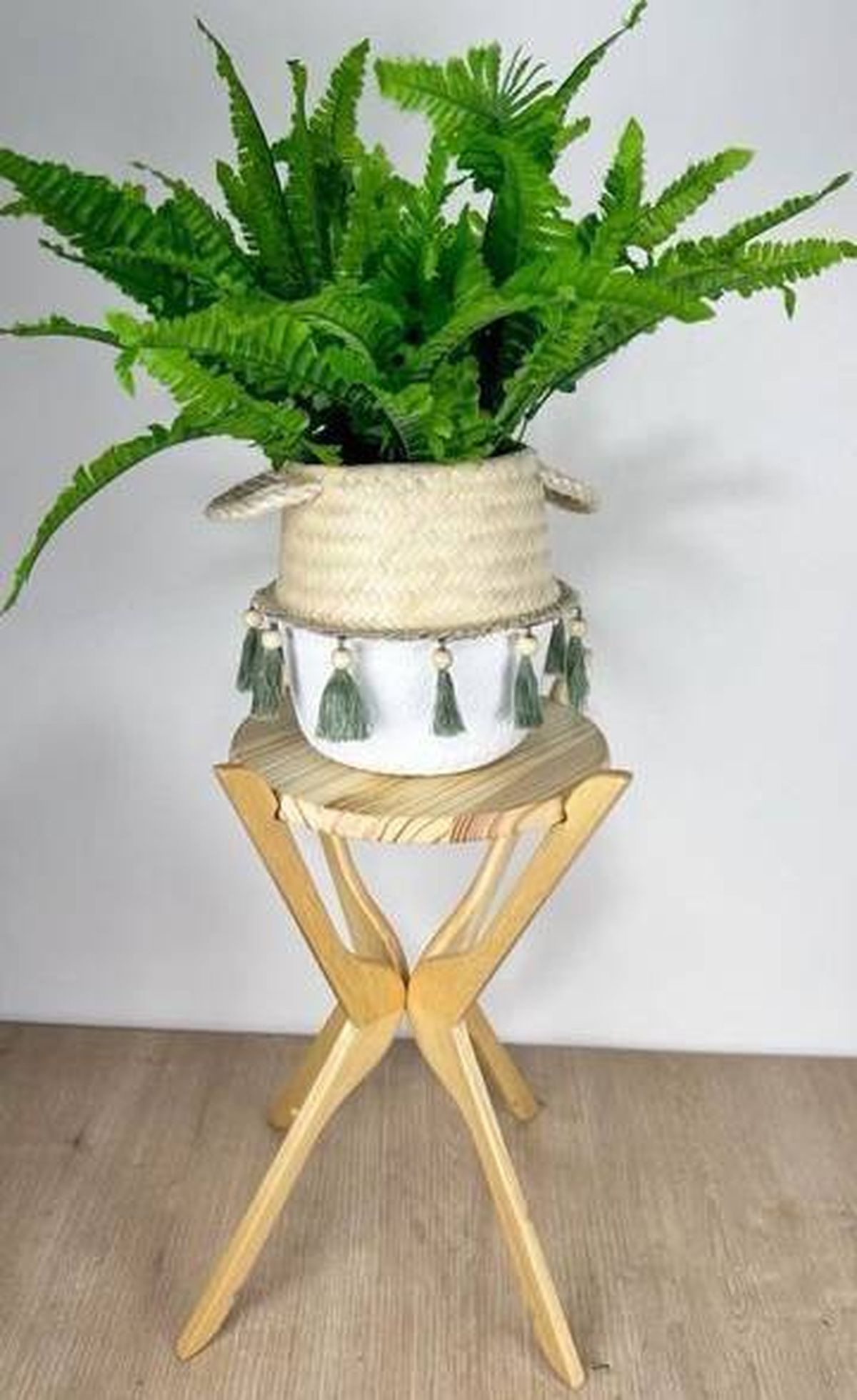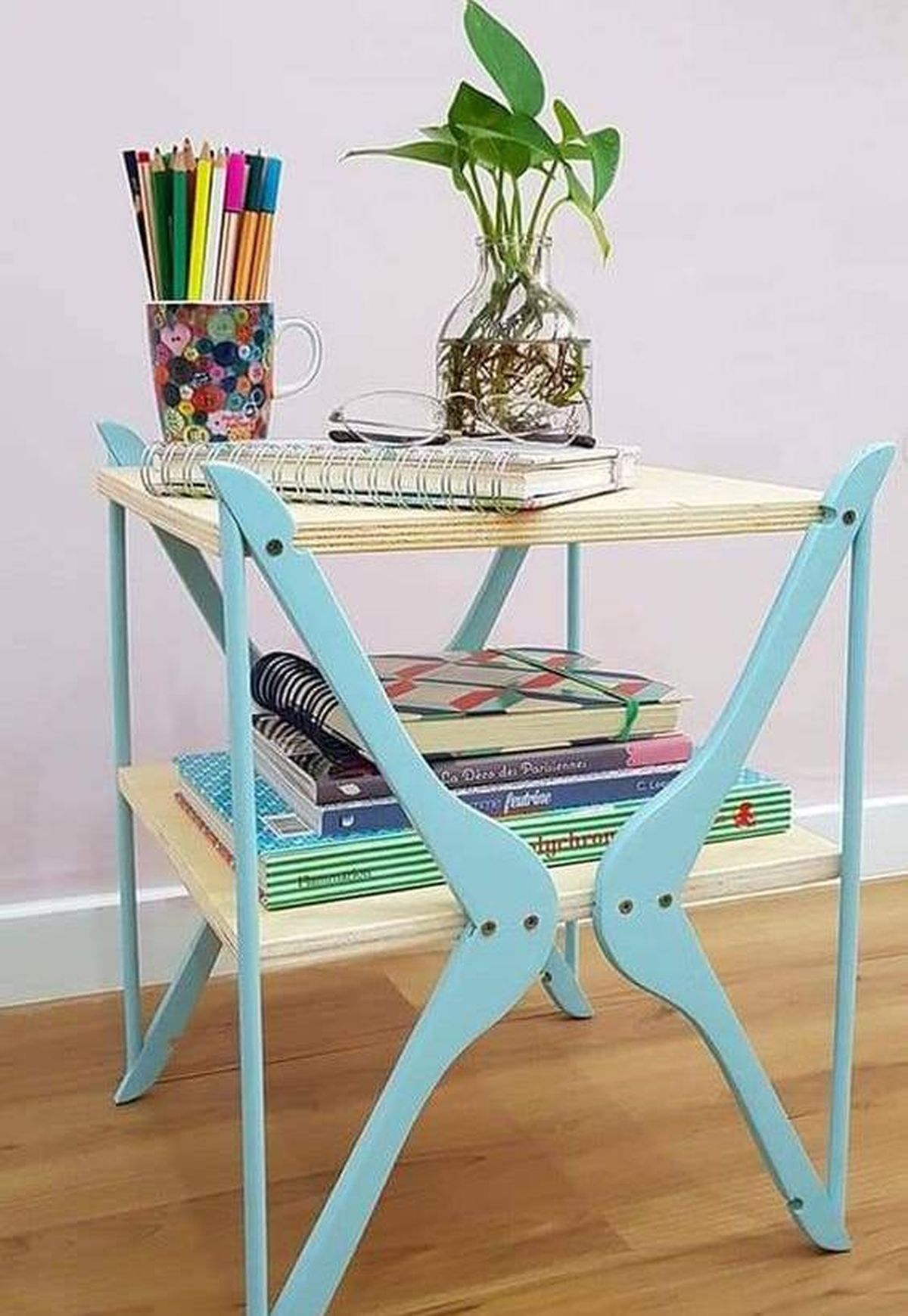 Para terminar súmale una tabla de madera circular teniendo en cuenta que la circunferencia de la misma tiene que ser medida dependiendo del ancho que haya entre las perchas unidas. Así te quedará una hermosa mesa ratona para tu hogar.