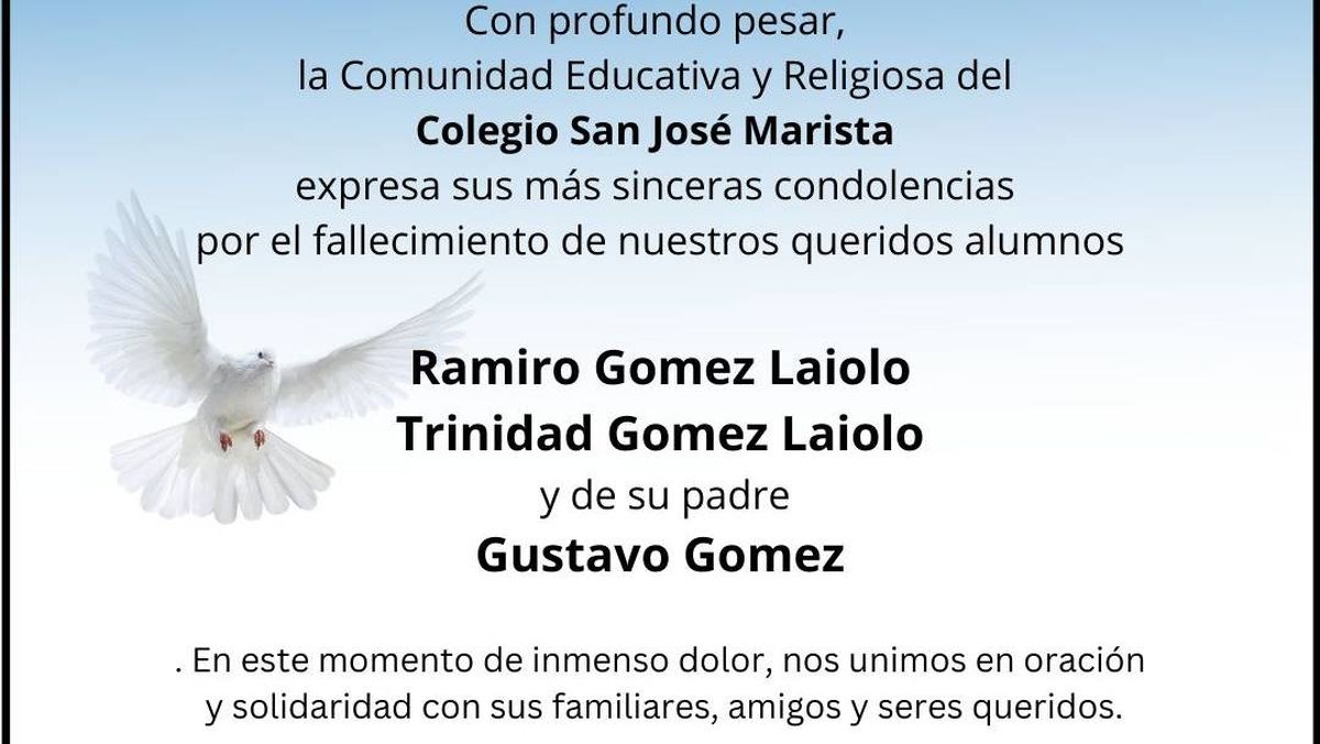 Por su parte, el Colegio Maristas también expresó su acompañamiento en este difícil momento. En un mensaje difundido en la tarde-noche del lunes, manifestó: “Las familias de la Promo 24 acompañamos a Carolina, Pía y Mica en este tristísimo e inentendible momento”.