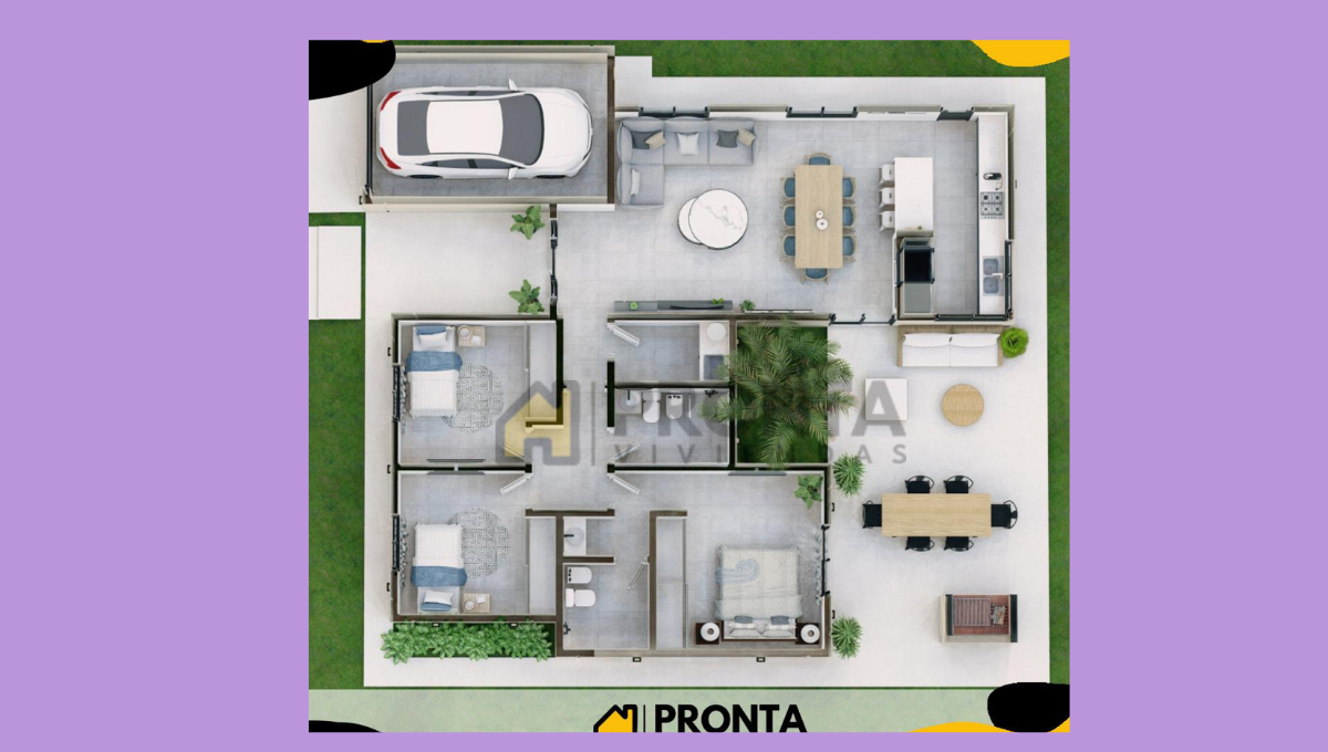 El modelo de casa prefabricada también presenta, según lo que puede verse en sus planos, con un espacio para un pequeño patio interno en el medio de la vivienda, para darle un toque moderno y diferente a la propiedad.