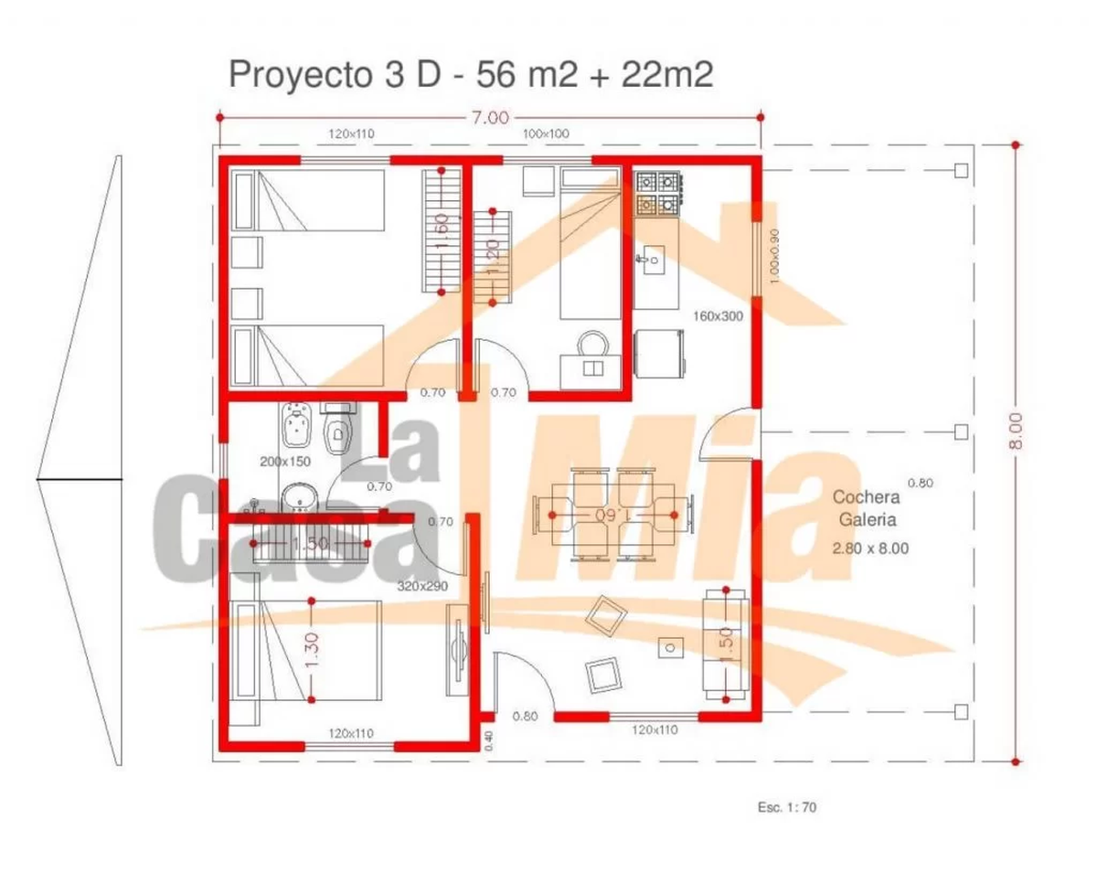 Según la descripción que da el sitio de la empresa La Casa Mia de esta casa prefabricada, esta se encuentra hecha en una versión minimalista y posee tres dormitorios, un baño, comedor, living y cocina distribuidos en 78 metros cuadrados. Además, posee las siguientes características: